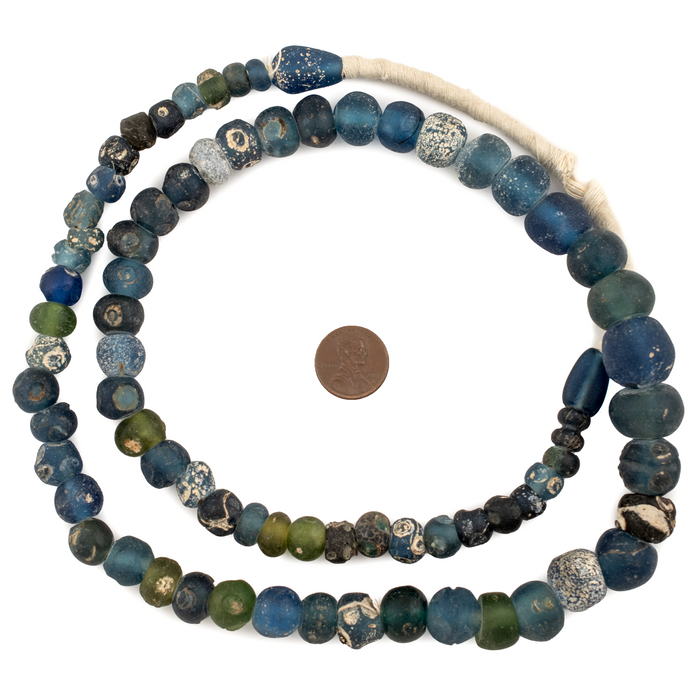 Rare strand of original Ancient Roman Eye Beads from Mali West Africa. These beauties are said to be hundreds of years old and are hard to come by. Typically they are found in sub-Saharan Africa where they they are discovered individually among the shifting sands. Look carefully to admire the age and craftsmanship that has gone into making each handmade glass bead. The eye motif has been prized since antiquity as a safeguard from bad luck and evil intent. This strand measures approximately 30" in length with individually beads measuring 8-17mm in diameter. There are approximately 73 beads on the strand and you will receive the exact strand pictured. Expect nicks, scratches and other imperfections due to the age of these beads. Add these beads to your special collection or use to make that special adornment! Only one strand available.