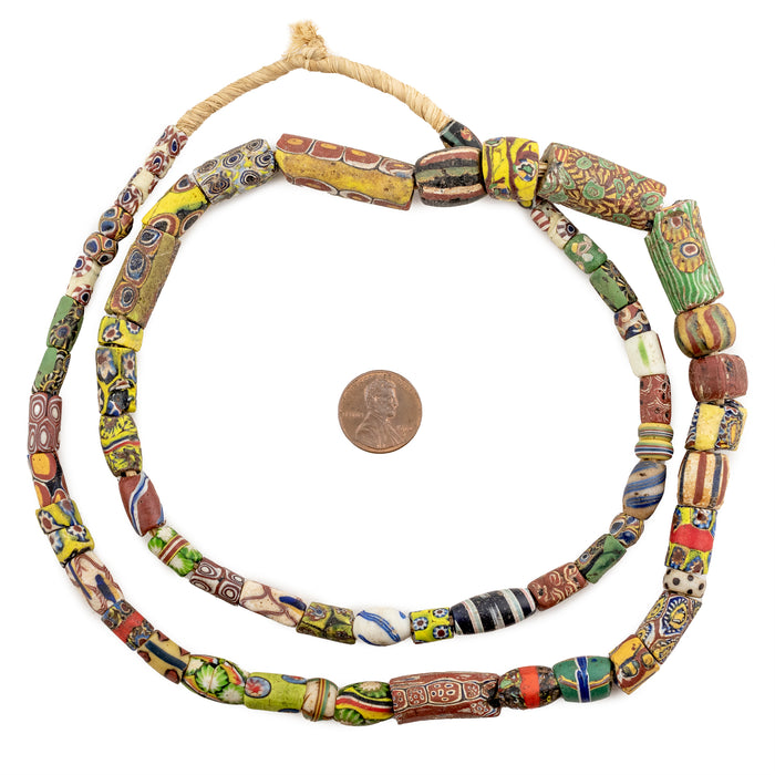 Take a look at this beautiful antique strand of Venetian Millefiori trade beads! Celebrated among the most distinctive of beads, the Millefiori has become nearly synonymous with the West African Trade. Made from famed Murano glass, Millefiori beads derive their name from the Italian words for “Thousand Flowers” due to the characteristic floral motifs that decorate their surface. Millefiori beads were made throughout the 19th and 20th century primarily for export to Africa. Today they are found in many countries including Ivory Coast, Nigeria, and Ghana where they are also known by their Ashanti name “Chachasao”. Most beads are commonly cylindrical in shape but other varieties exist including rectangular, oval, and sometimes even hexagonal beads. You will receive the exact strand pictured. Measurements are approximations.