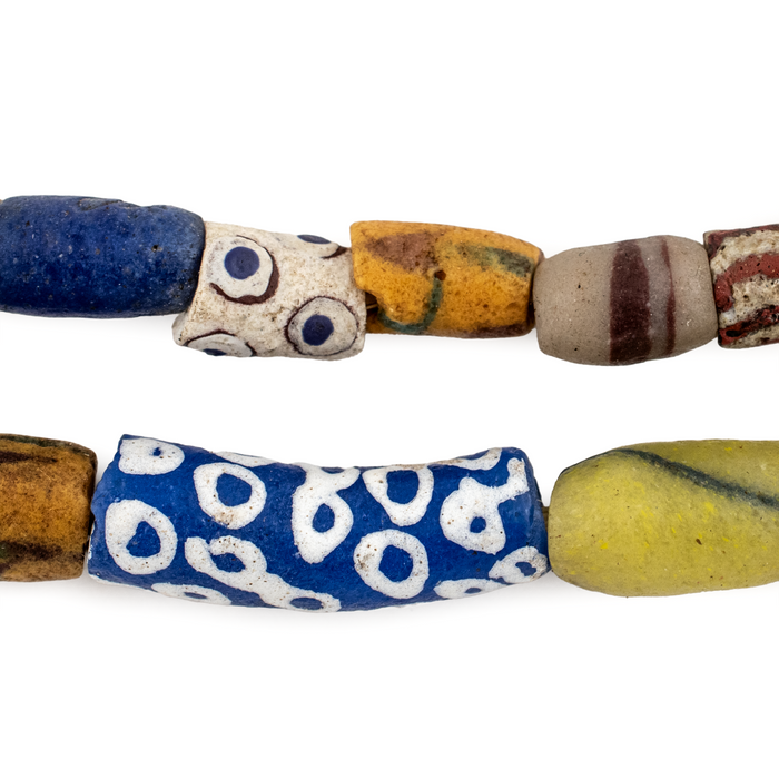 Checkout this beautiful long strand of fancy mixed African Sandcast Beads. The process of making these beads is unique to Africa and has been used for over 1000 years. Pulverized glass of various colors is poured into a clay mold, using a cassava stem for the bead's hole. The mold is placed in a furnace and heated until the glass particles congeal without actually melting and the stem burns out. The Ghanaians have been making beads in this manner since the 1600s. Each strand is unique and may vary slightly from photo.