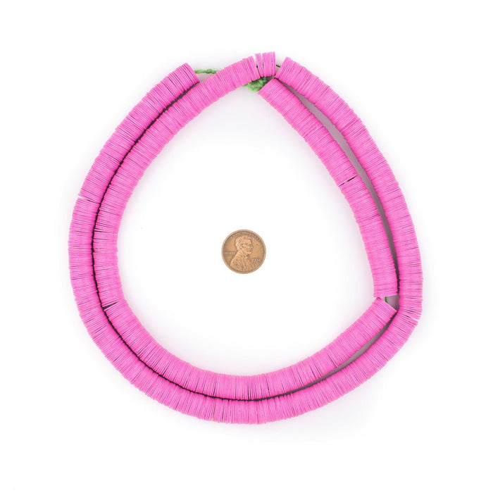 Take a look at this beautiful strand of African vinyl beads in a pink color. Beads such as these are found in Ghana and Nigeria where they are sometimes worn as waist beads. Older versions of vinyl beads were said to be made from recycled phonograph records. This strand measures approximately 30" long with individual beads measuring 1 x 10mm. These beads are light and fun to wear and also versatile for jewelry designs. Each strand is sold individually.