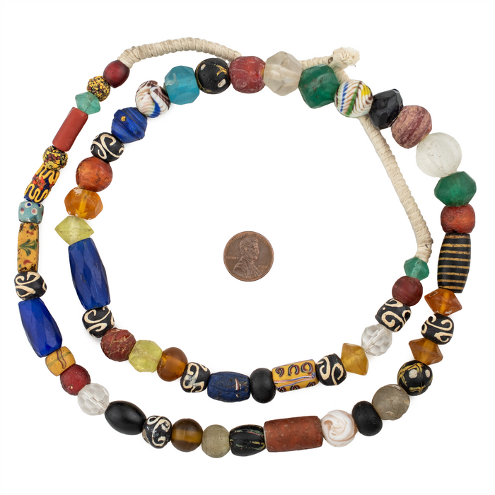 Looking for a truly unique strand of antique mixed trade beads? Then look no further. This beautiful strand of old african trade beads contains a medley of hard to find beads. Each strand is unique but strands may include special beads including Bodom beads, Murano Red good beads, Millefiore, Red white and blue beads, French cross, King beads, Old powder glass beads, Dog tooth beads, Cornaline d'Aleppo Venetian Trade Beads, Russian Blue, Floral Venetian Beads, and many other unusual varieties of old African Trade Beads. These beads are for the designer and collector alike. You will receive the exact strand pictured. Some beads may be cracked and/or show signs of age. These mixed beads are truly exceptional!