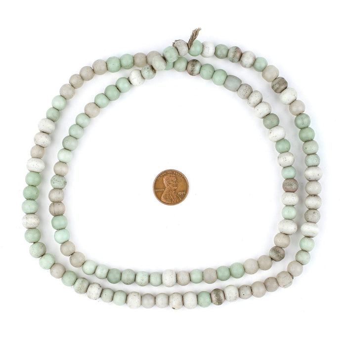 Old Padre beads come in a number of varieties however padres in this moon green color are difficult to find. The age of the glass is apparent in the unique imperfections that come with time. Old padre beads such as these are found in Ethiopia, East Africa. Originally European-made, they were traded in Africa the late 1800 early 1900's. Each beads measures approximately 7 x 8-9mm. Each strand is approximately 33 inches in length. Limited supply available.