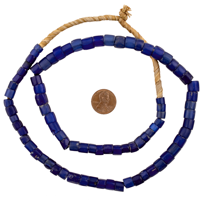 Among the most celebrated of faceted beads, Russian Blues derive their romantic name from their involvement in the Russian fur trade of the Pacific Northwest where they first appeared in the America’s during the early 1800’s. Inspired by faceted gemstone beads, the art of faceting glass was mastered by the artisans of Bohemia. There, as nowhere else in the Europe, the plentiful supply of running water supplied the energy necessary to operate the grinding wheels used to cut glass. These beads, designed for export were subsequently distributed to traders and found their way to both Africa and the Americas. Authentic Russian Blue beads such as these were produced in a number of shapes and shades, some more rare than others. Look carefully and you can see the unique quality of these hand-faceted beads apparent in the slight irregularity of the individual facets. Each bead measures approximately 6-9 x 7-10mm with about 70 beads per strand and 26-27" long including raffia. This listing is for Russian Blue beads with a more smoothed and worn surface. Strand shown is representative however each strand is unique and will vary. Please let us know in advance if you have specific requirements. Don’t miss your chance to own this special piece of history today!