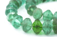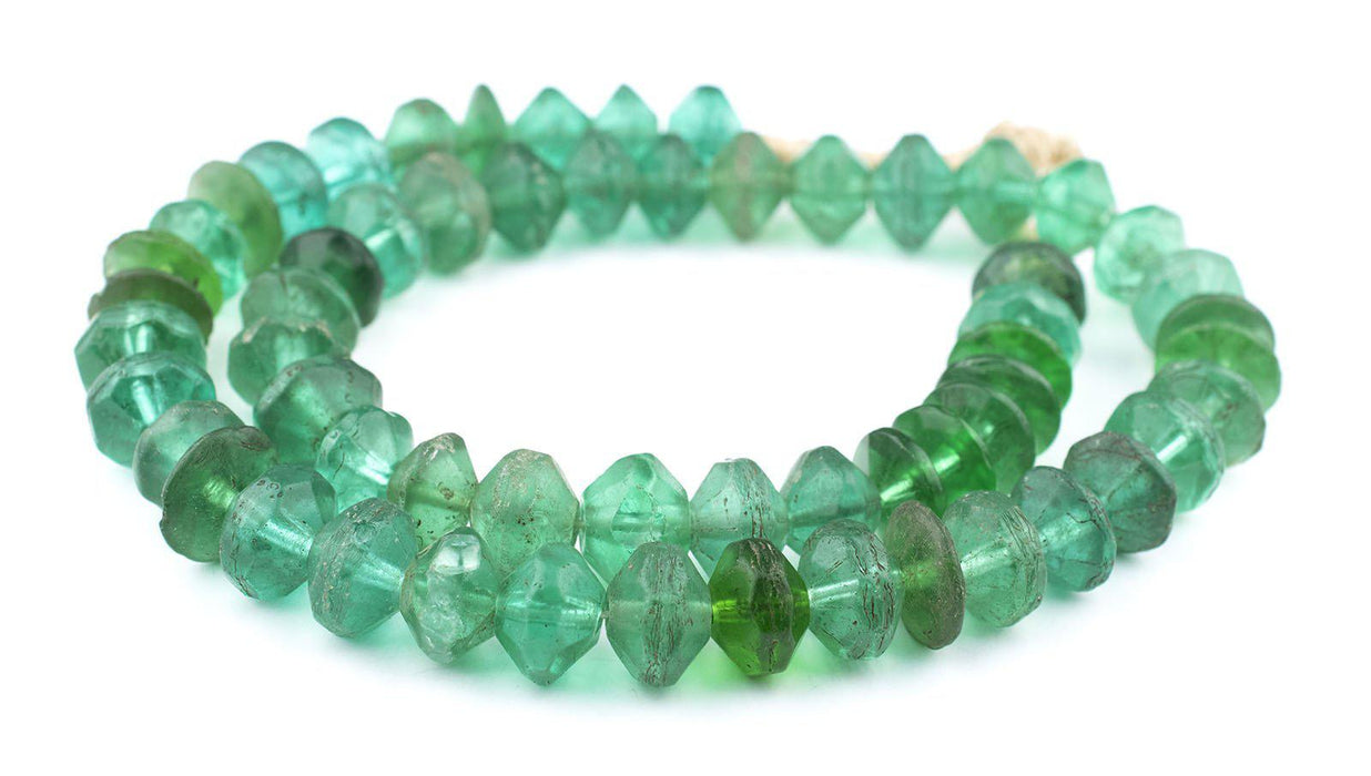 Green vaseline beads are among the more common glass trade beads from Ethiopia. Originally made in Czechoslovakia many decades ago, we sourced these beautiful glass bicone beads from the Oromo region in southern Ethiopia. Having been made by hand, each bead varies slightly in shape and size. The beads traditionally come in several colors, with green being more common. Despite this, these beads are becoming increasingly hard to find.