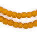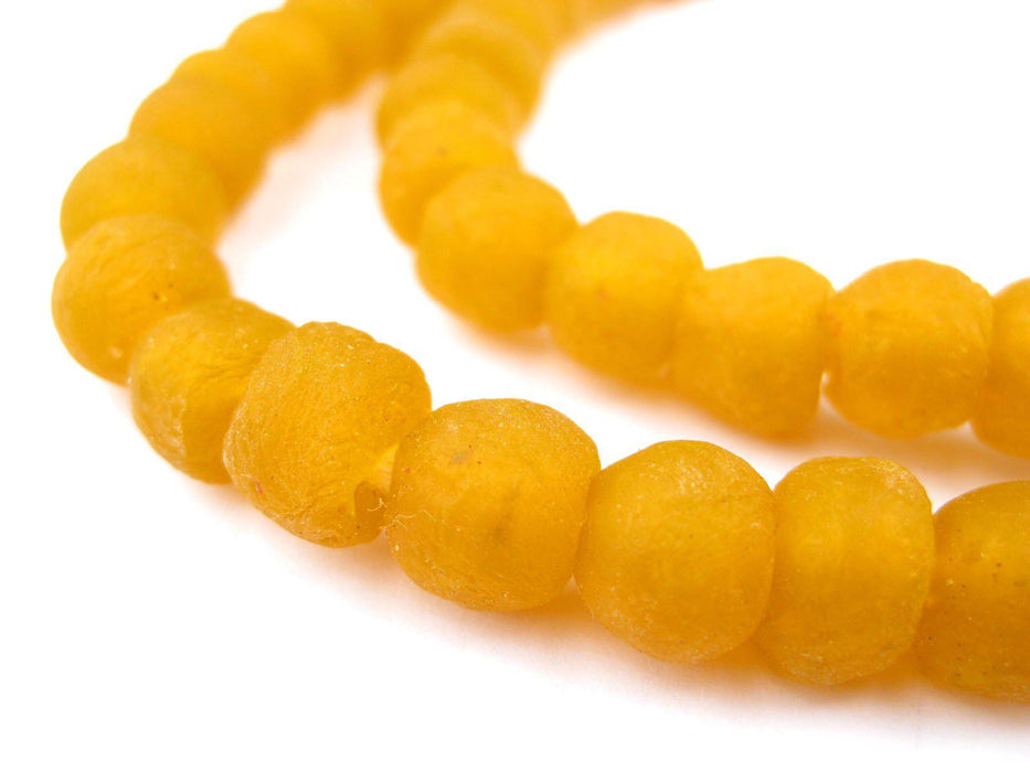Recycled glass beads are a type of indigenously produced African bead from Ghana West Africa. These beautiful orange color recycled beads are made using an old method that has been used for centuries. The glass itself is derived from a variety of recycled sources including old beverage and medicine bottles. The procedure for making the beads consists of a number of steps whereby powdered glass is poured into molds of clay and baked in a specialized oven. These beads are produced in large part by the Krobo tribe and through recycling glass are environmentally friendly.