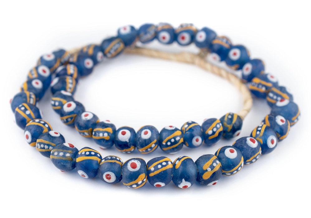 Recycled glass beads are a type of indigenously produced African bead from Ghana West Africa. These beautiful blue color recycled beads are made using an old method that has been used for centuries. The glass itself is derived from a variety of recycled sources including old beverage and medicine bottles. The procedure for making the beads consists of a number of steps whereby powdered glass is poured into molds of clay and baked in a specialized oven. These beads are produced in large part by the Krobo tribe and through recycling glass are environmentally friendly. Unlike typical recycled glass beads, these have been carefully painted with a design intended to resemble fancy Venetian glass beads. Get the look without the price!