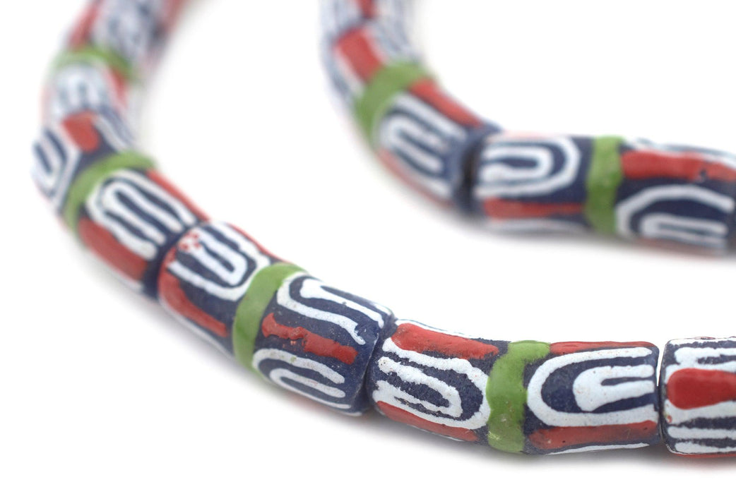 This beautiful strand of African powder glass beads was made by the people of Krobo Mountain in Ghana, West Africa. Many designs of Krobo beads are patterned to resemble old Venetian fancy trade beads. They are made from bottles and other glass items that are turned into powder, then poured into molds in order to create beads. Decorations on the beads are made with a paste made of colored glass powder and water which is applied by hand using a thin wooden stalk. The beads are cooked a second time to fix the decor. Each bead measures approximately 24-28 x 10-11mm with a hole size of approximately 3mm. You will receive a full strand measuring approximately 31". Limited supply.