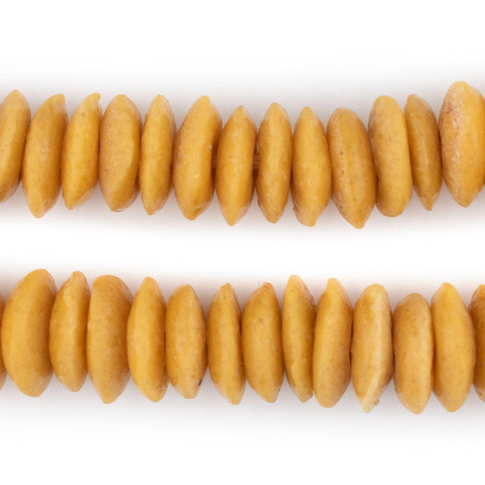 Checkout this beautiful strand of orange Ashanti glass saucer beads. The process of making these beads is unique to Africa and has been used for over 1000 years. Pulverized glass of various colors is poured into a clay mold, using a cassava stem for the bead's hole. The mold is placed in a furnace and heated until the glass particles congeal without actually melting and the stem burns out. The Ghanaians have been making beads in this manner since the 1600s. Each bead measures approximately 4-5 x 12-14mm in size, with strands measuring approximately 24". Beautiful beads at a great price!