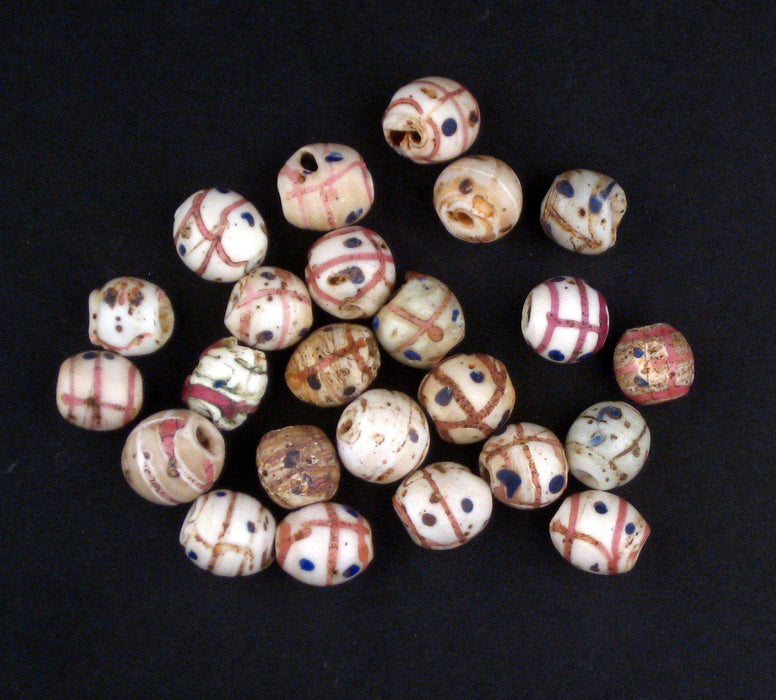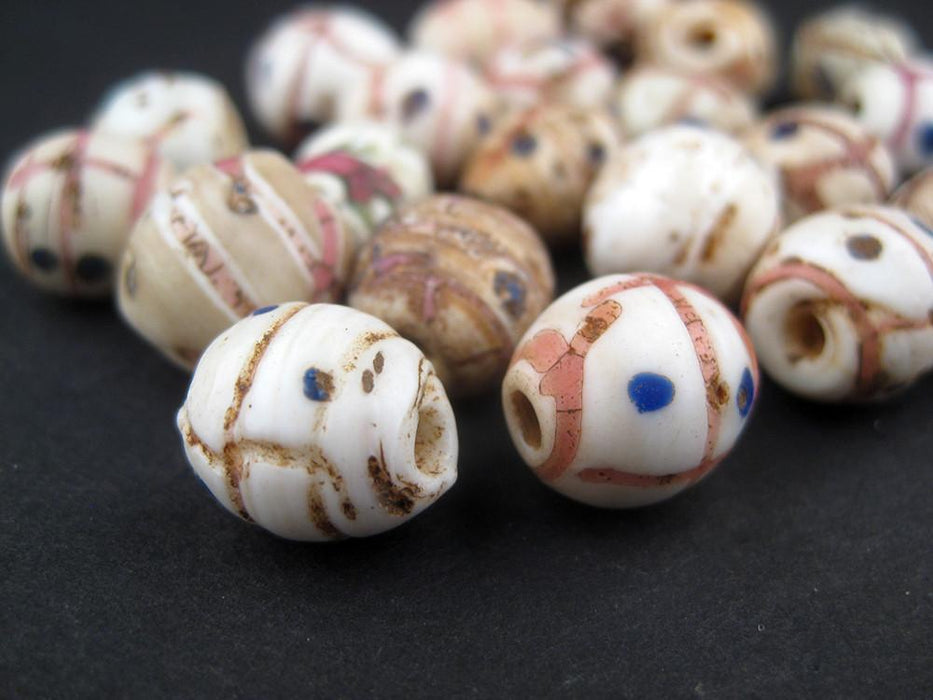 Beautiful old venetian medicine man beads. These beads have traveled at least three continents and were originally traded in the 1800's. Each bead is unique and may vary in condition, color, pattern of dots, and size. Your beads will be selected randomly from our collection. Some beads may have chips or scratches due to age. Own a piece of history with these amazing beads. Hard to find.