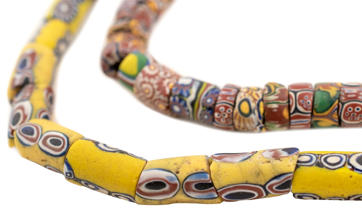Take a look at this beautiful antique strand of Venetian Millefiori trade beads! Celebrated among the most distinctive of beads, the Millefiori has become nearly synonymous with the West African Trade. Made from famed Murano glass, Millefiori beads derive their name from the Italian words for “Thousand Flowers” due to the characteristic floral motifs that decorate their surface. Millefiori beads were made throughout the 19th and 20th century primarily for export to Africa. Today they are found in many countries including Ivory Coast, Nigeria, and Ghana where they are also known by their Ashanti name “Chachasao”. Most beads are commonly cylindrical in shape but other varieties exist including rectangular, oval, and sometimes even hexagonal beads. You will receive the exact strand pictured. Measurements are approximations.