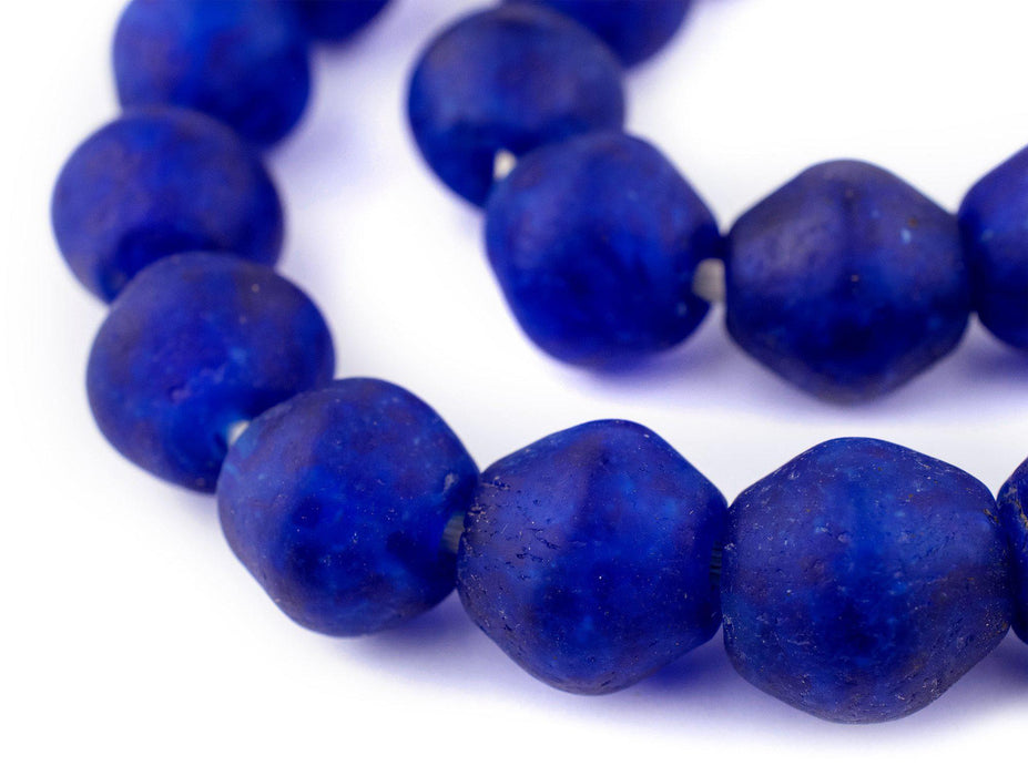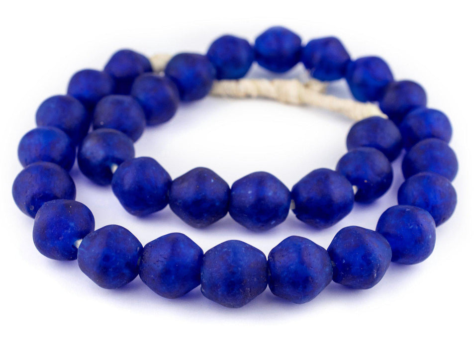 Take a look at this exceptionally large strand of jumbo-sized blue recycled glass beads. Large beads such as these are hard to find and even harder to find in good condition. The journey from Africa can sometimes be unkind to such large beads! This strand is sure to make an impression wherever it goes. Use these beads as centerpieces for special jewelry, as adornments for interior design, or even as a wall hanging to decorate your favorite room. You will receive a 32" strand with approximately 30 beads. Each strand is unique and may vary slightly from strand pictured.