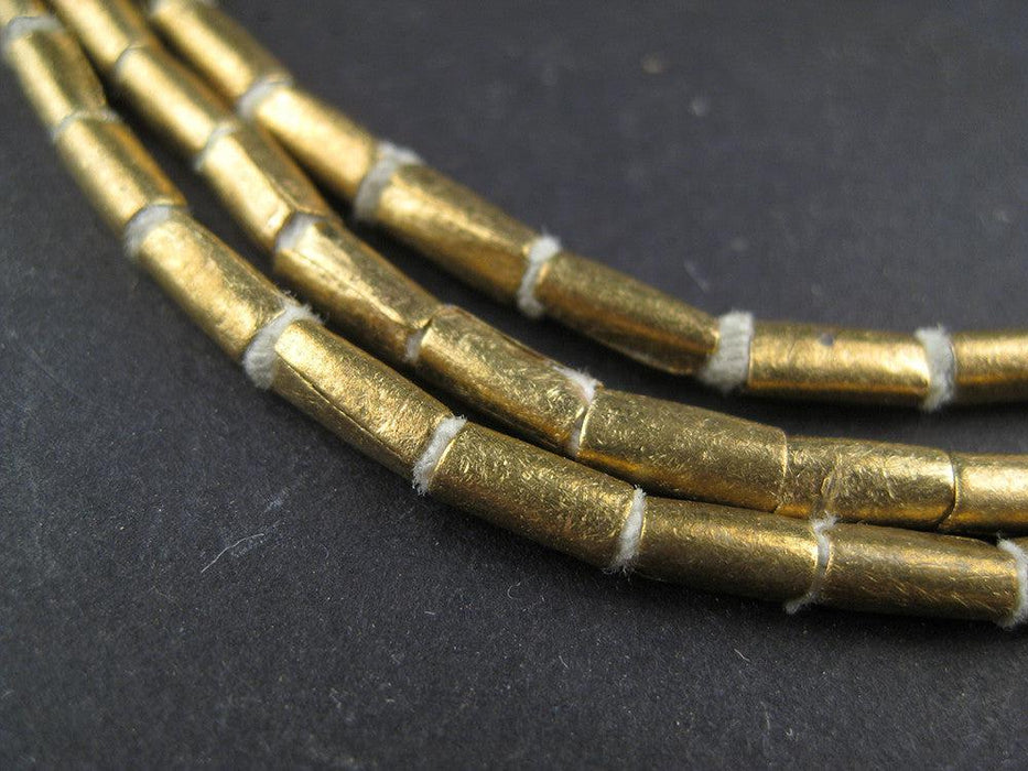 Beautiful strand of brass tube beads from Ethiopia!. Beads are 6-8mm long with a diameter of 3mm. This extra long strand measures approximately 32 inches in length. Shade of brass may vary slightly from strand to strand.