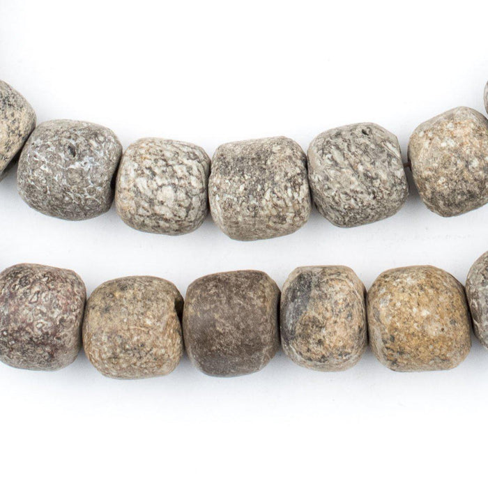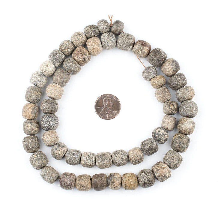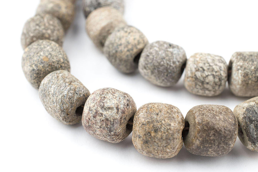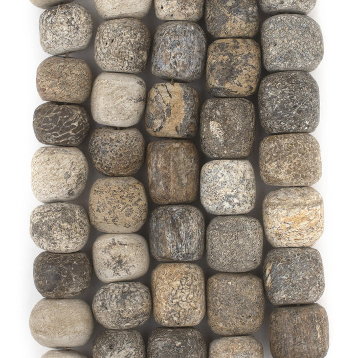 These unusual beads are individually carved from fossilized Stegodon, an ancient animal from the Proboscidea family. These trunk-bearing mammal creatures inhabited areas near the Solo River in central Java from 11.6 mya to late Pleistocene, with some records suggesting they may have survived up until four millennium ago. The name for stegodon comes from the Greek word "stegein," which roughly translates to "roofed tooth," a testament to the creature's distinctive molars.