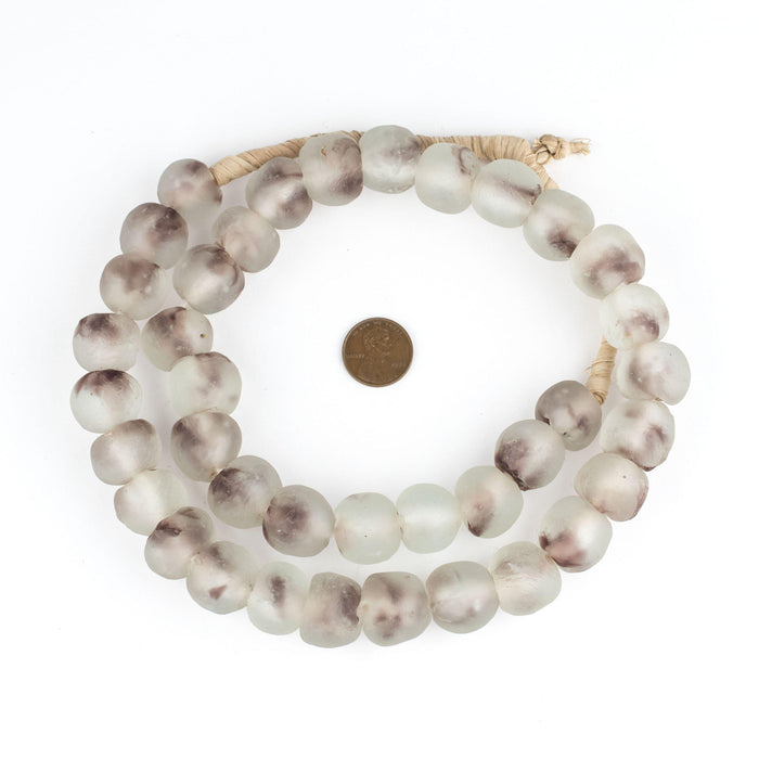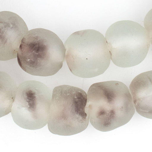 Recycled glass beads are a type of indigenously produced African bead from Ghana West Africa. These beautiful purple recycled beads are made using an old method that has been used for centuries. The glass itself is derived from a variety of recycled sources including old beverage and medicine bottles. The procedure for making the beads consists of a number of steps whereby powdered glass is poured into molds of clay and baked in a specialized oven. These beads are produced in large part by the Krobo tribe and through recycling glass are environmentally friendly.