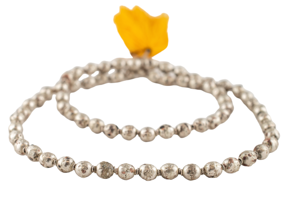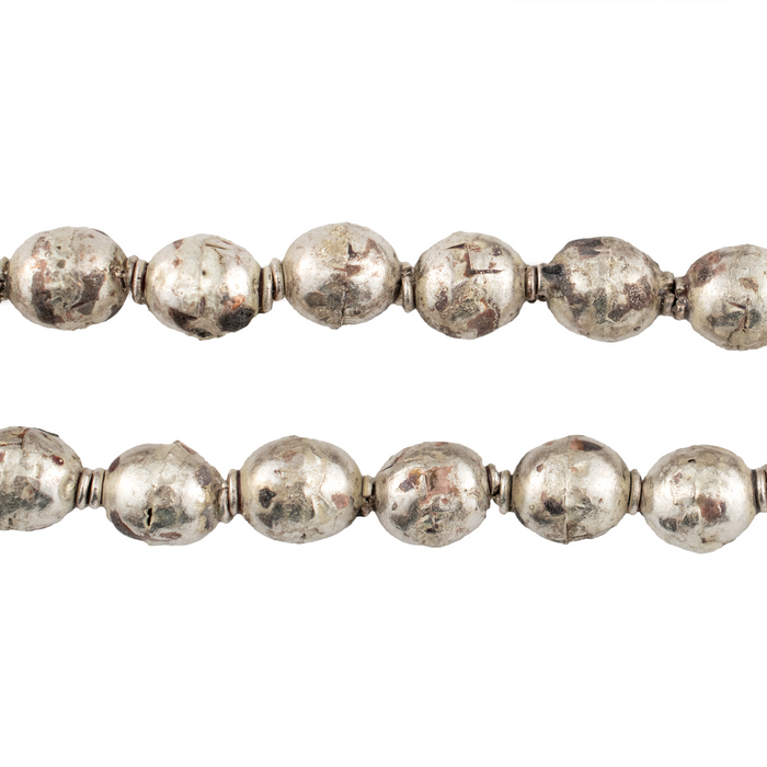 These beautiful silver beads come from Ethiopia. The strand is 33-39" long with beads measuring 12-14mm in length with approximately 8mm in diameter. The strand comes with one funnel shaped bead at the end enhanced with brightly colored tassel. Tone of silver may vary slightly from photo.