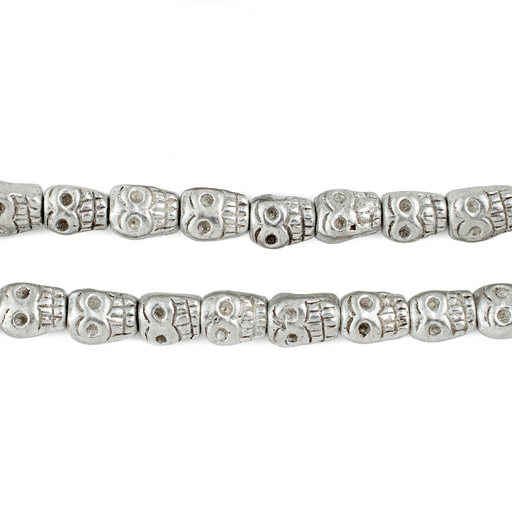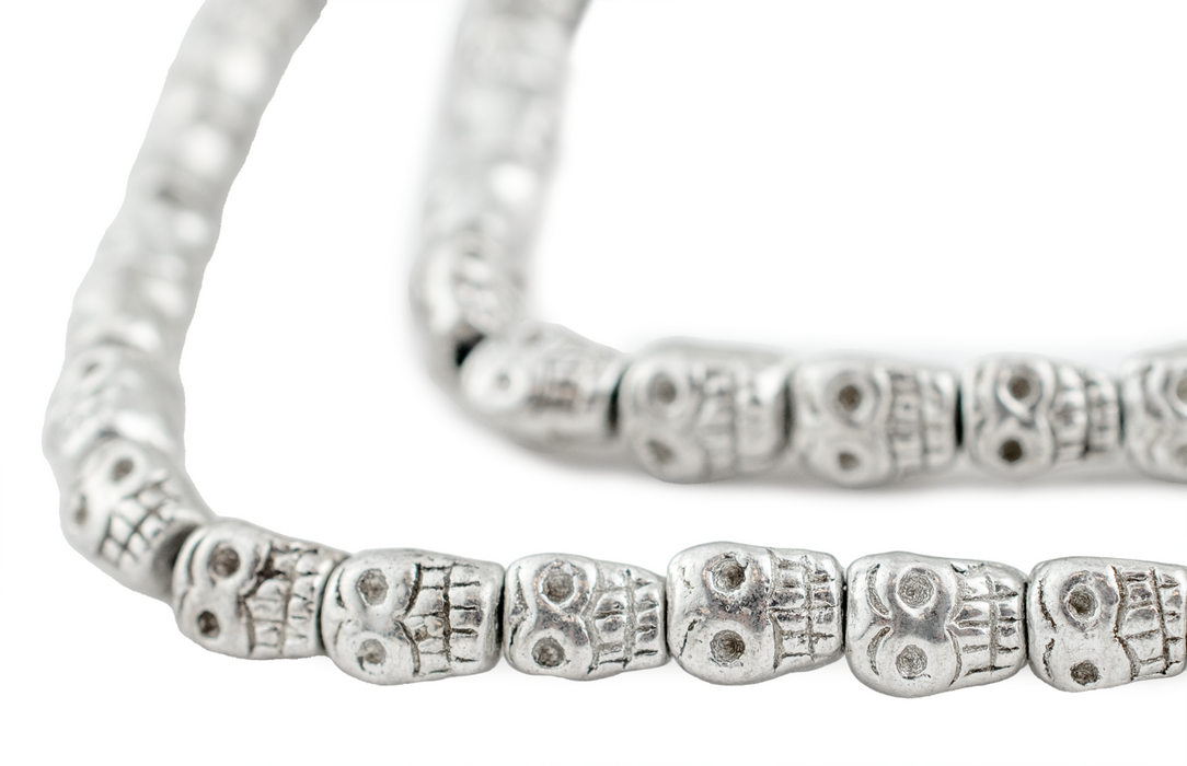 These silver skull beads are casted using solid metal and hand polished to perfection. Take note and you will see they are higher quality than most skull beads in the market, making them a great fit for high-end jewelry designs. Each bead measures approximately 7-8 x 5-6mm with a hole size of 1mm. Each strand measures 16 inches and includes approximately 54 beads. Available in silver, brass, and copper colors. Multiple strands pictured. Each strand sold individually. Get yours today!