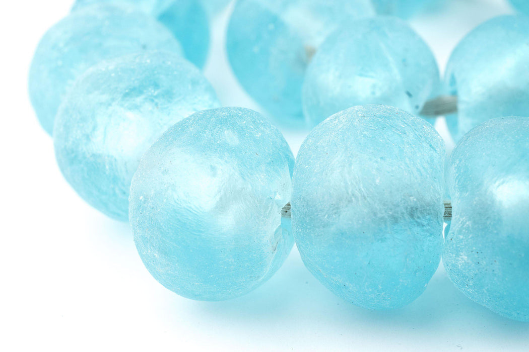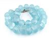 Take a look at this exceptionally large strand of jumbo-sized clear marine recycled glass beads. Large beads such as these are hard to find and even harder to find in good condition. The journey from Africa can sometimes be unkind to such large beads! These beads are sure to make an impression wherever they go. Use them as centerpieces for special jewelry, as adornments for interior design, or even as a wall hanging to decorate your favorite room. You will receive a 31" strand with approximately 28 beads. Recycled glass beads are a type of indigenously produced African bead from Ghana West Africa. These special beads are made using an old method that has been used for centuries. The glass itself is derived from a variety of recycled sources including old beverage and medicine bottles. The procedure for making the beads consists of a number of steps whereby powdered glass is poured into molds of clay and baked in a specialized oven. These beads are produced in large part by the Krobo tribe and are environmentally friendly. Some beads may have chips or internal fractures due to long journey. Non-USA buyers, please note that a heavy-weight surcharge may apply for this item. Please inquire in advance if you would like to pre-confirm this fee.