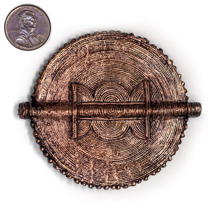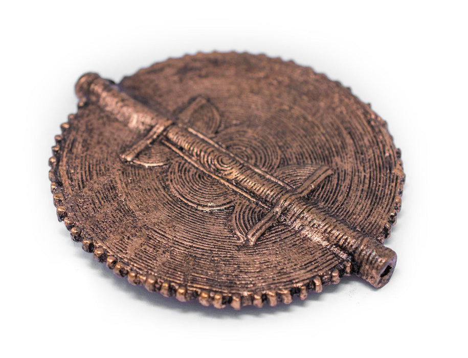 This beautiful copper bead is hand casted in the design of the traditional "Baule sun" from the Ivory Coast. Increasingly difficult to find, Baule (also known as Baoule) tribal beads are some of the most unique casted beads from West Africa. Each bead measures approximately 75 x 65mm, with a hole size of approximately 2mm. We've partnered with a special workshop to bring this unique treasure to you. Pay close attention to the detail and note the high quality finish of this special bead. Great as a pendant centerpiece on your next jewelry design! This artisan product is made using premium copper electroplating over brass to make these copper finish customer favorites.