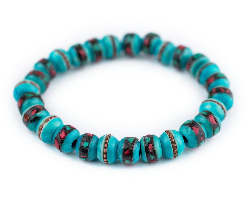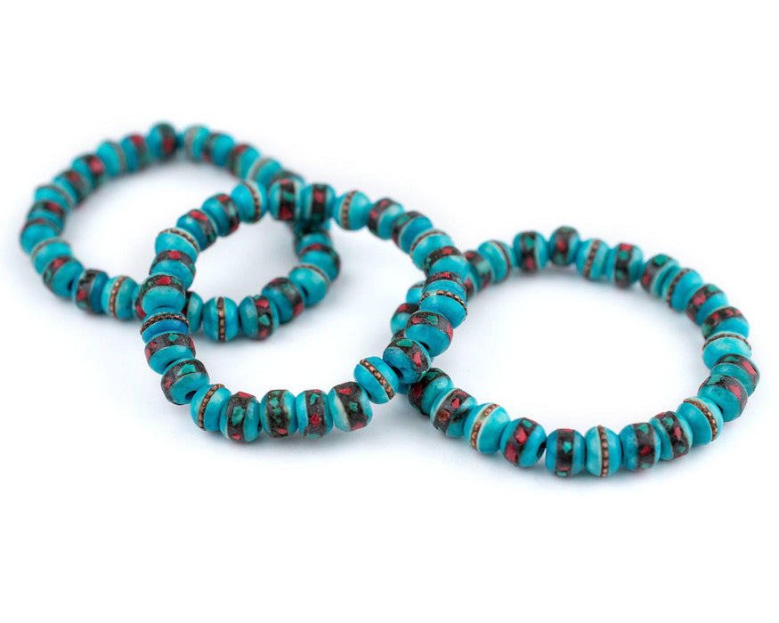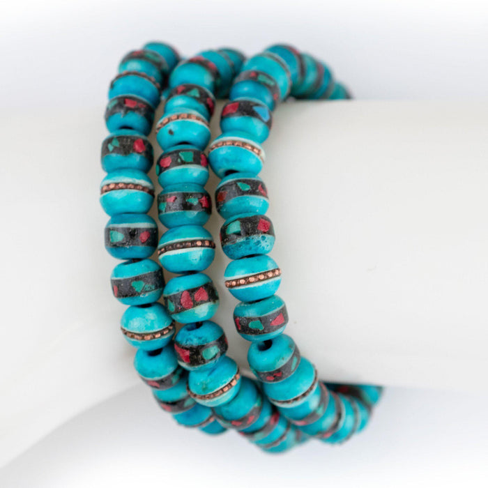 Malas are traditionally used in Buddhist culture as a part of the practice of meditation, however, today malas are enjoyed by people around the world looking to gain mental clarity and live in the present. Our collection of mala bracelets are handmade in Nepal using traditional inlaid beads. These beads are hand carved, inlaid with coral and turquoise style pieces, and strung 27 beads per 7.5 inch bracelet. Available in over 15 colors, choose your favorites to build your own unique stack! Beads may also be repurposed into your own unique jewelry designs. Multiple bracelets may be pictured, however each bracelet is sold individually.
