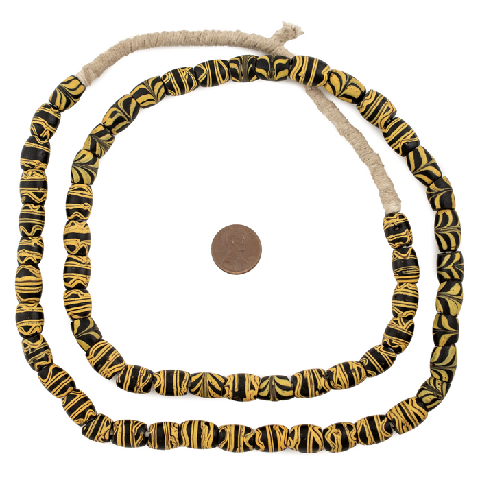 This beautiful strand of Antique Venetian Trade Beads has a distinctively tribal fair. The intense contrast between between the yellow and black colors gives a bold character to each bead. Old Trade Beads such as these were produced during the 18th and 19th century for Trade with Africa. Today, bead such as this are hard to find and coveted by collectors and bead aficionados. This special strand measures 32" long with approximately 59 beads measuring 13-15 x 9-10mm. You will receive the exact strand pictured.