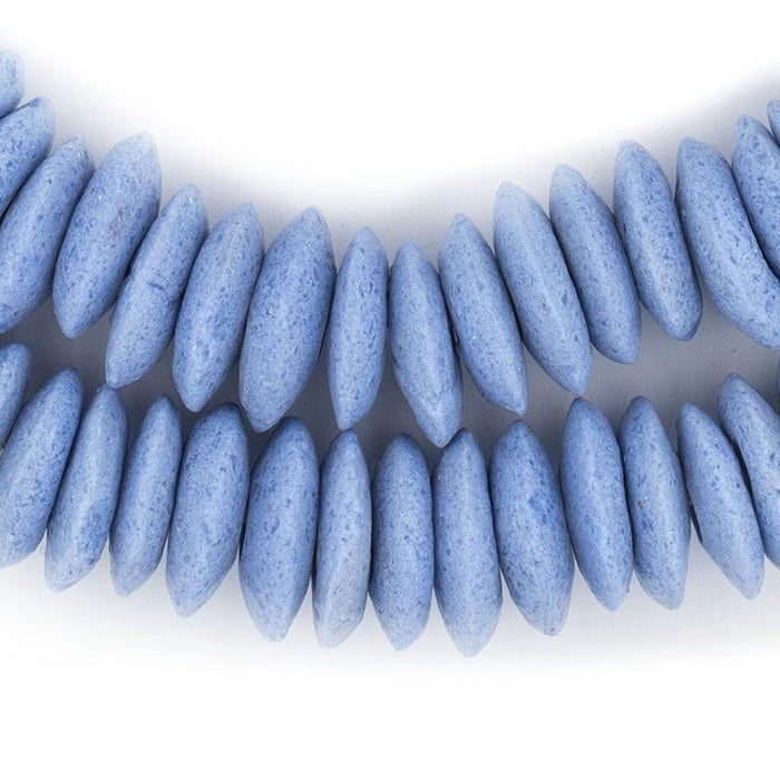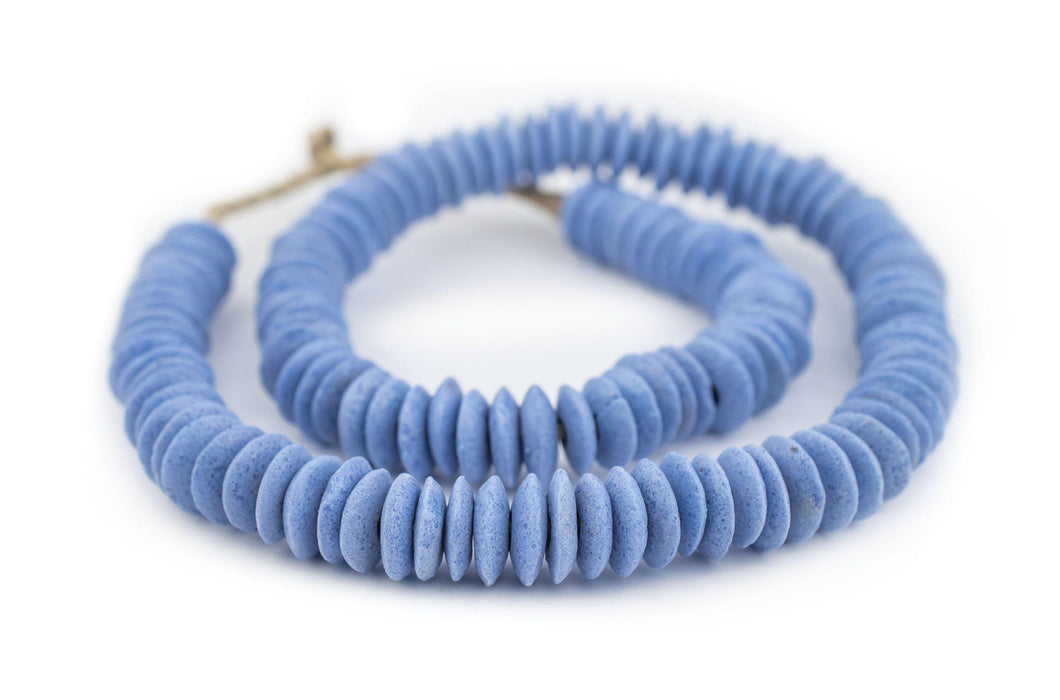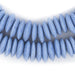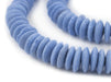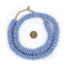 Checkout this beautiful strand of blue color Ashanti glass saucer beads. The process of making these beads is unique to Africa and has been used for over 1000 years. Pulverized glass of various colors is poured into a clay mold, using a cassava stem for the bead's hole. The mold is placed in a furnace and heated until the glass particles congeal without actually melting and the stem burns out. The Ghanaians have been making beads in this manner since the 1600s. Each bead measures approximately 13-14mm in diameter. Color may vary slightly from strand to strand.