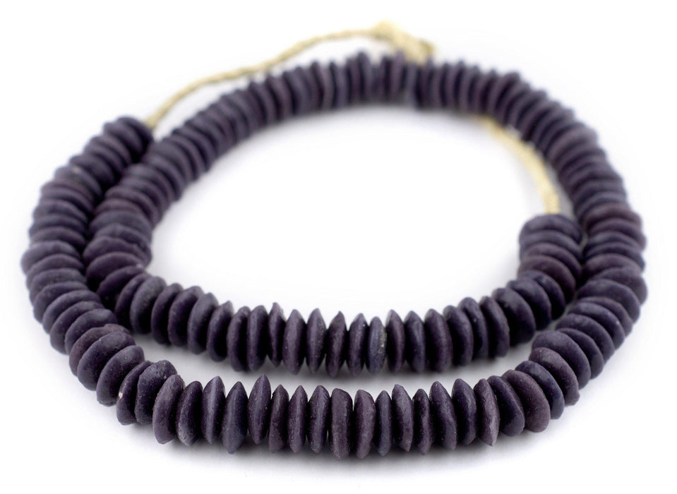 Checkout this beautiful strand of purple color Ashanti glass saucer beads. The process of making these beads is unique to Africa and has been used for over 1000 years. Pulverized glass of various colors is poured into a clay mold, using a cassava stem for the bead's hole. The mold is placed in a furnace and heated until the glass particles congeal without actually melting and the stem burns out. The Ghanaians have been making beads in this manner since the 1600s. Each bead measures approximately 13-14mm in diameter.