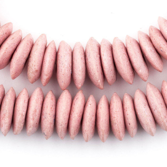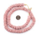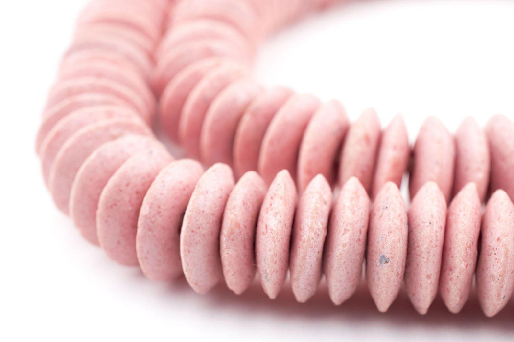 Checkout this beautiful strand of pink color Ashanti glass saucer beads. The process of making these beads is unique to Africa and has been used for over 1000 years. Pulverized glass of various colors is poured into a clay mold, using a cassava stem for the bead's hole. The mold is placed in a furnace and heated until the glass particles congeal without actually melting and the stem burns out. The Ghanaians have been making beads in this manner since the 1600s. Each bead measures approximately 13-14mm in diameter. Shade of pink may vary slightly from photo.