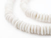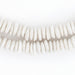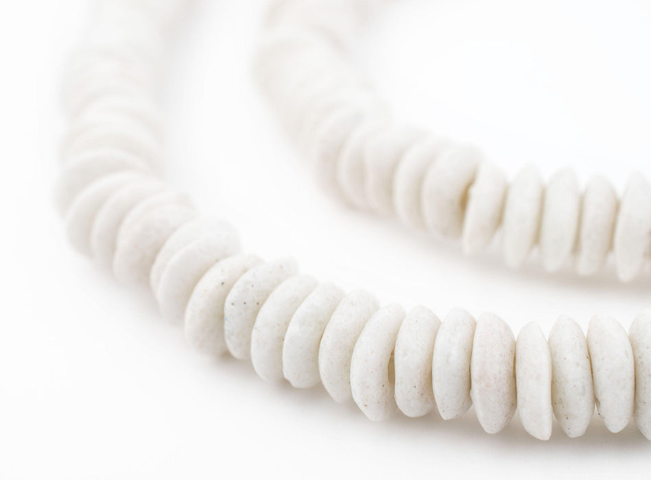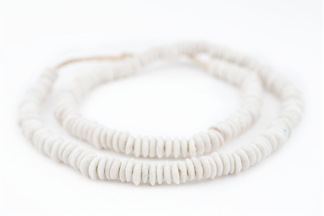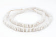 Checkout this beautiful strand of white Ashanti glass saucer beads. The process of making these beads is unique to Africa and has been used for over 1000 years. Pulverized glass of various colors is poured into a clay mold, using a cassava stem for the bead's hole. The mold is placed in a furnace and heated until the glass particles congeal without actually melting and the stem burns out. The Ghanaians have been making beads in this manner since the 1600s. Each bead measures approximately 2-3 x 8-9mm in size, with strands measuring approximately 24". Beautiful beads at a great price!