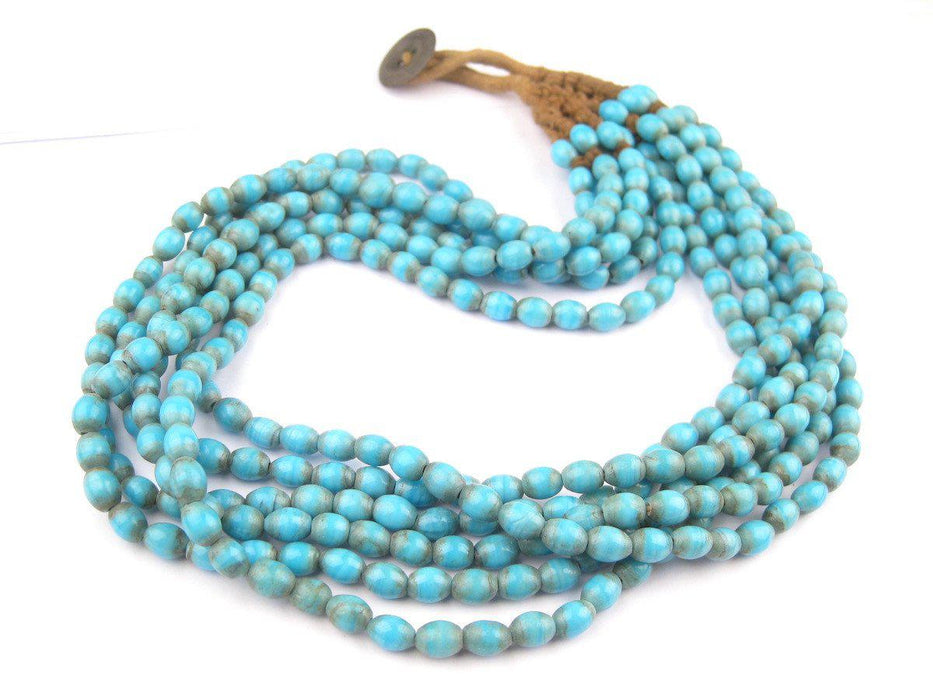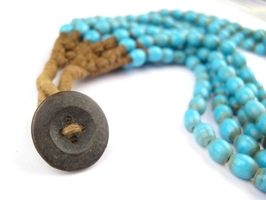 This beautiful vintage necklace, made from turquoise color glass, is from the Naga region of Northern India. These beads are from an old stock and the color and uniqueness of the individual pieces have an authentic handmade feel evident in the texture of the glass. Each necklace is comprised of as many as 325 beads that have been set together with a woven faster and a vintage button. Ready to wear 'as-is' or use the ample beads in your own unique designs. A small number of beads may be broken due to age and wear. Limited supply!