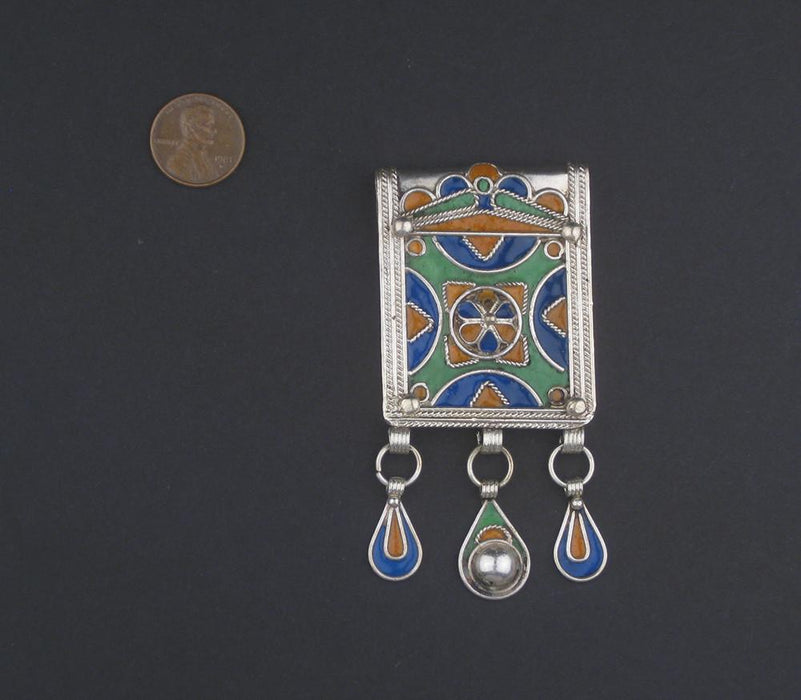 Unique pendant with unusual design. This enameled pendant is decorated with several colors and made using traditional techniques known to have been used by Jewish metal smiths. Jews are known to have lived in Morocco for nearly 2000 years and in historic terms were known for the talent at working metal and making jewelry. To this day, many artisanal metal designs are inspired by their ancient tradition. Design may vary slightly from pendant to pendant.