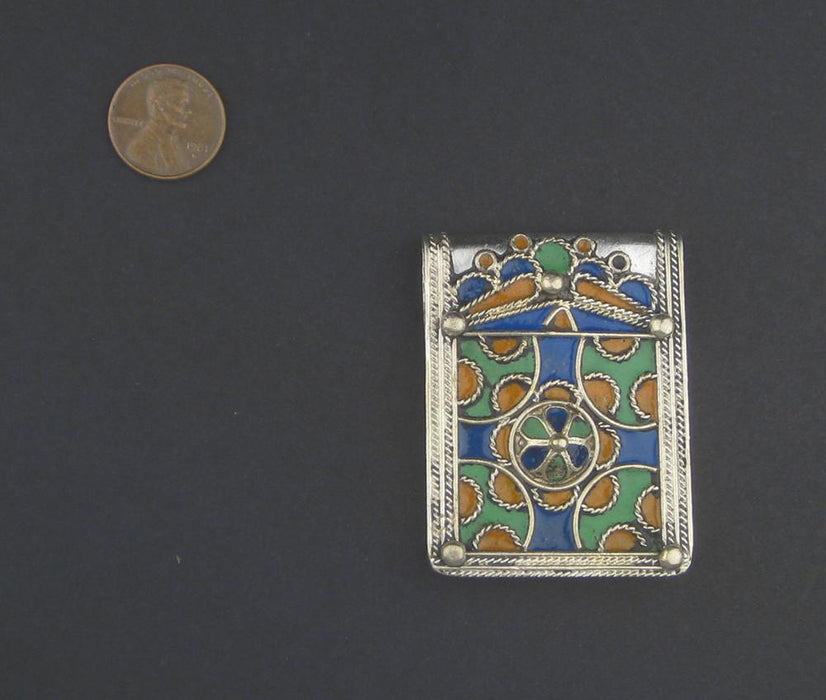 Unique pendant with unusual design. This enameled pendant is decorated with several colors and made using traditional techniques known to have been used by Jewish metal smiths. Jews are known to have lived in Morocco for nearly 2000 years and in historic terms were known for the talent at working metal and making jewelry. To this day, many artisanal metal designs are inspired by their ancient tradition.