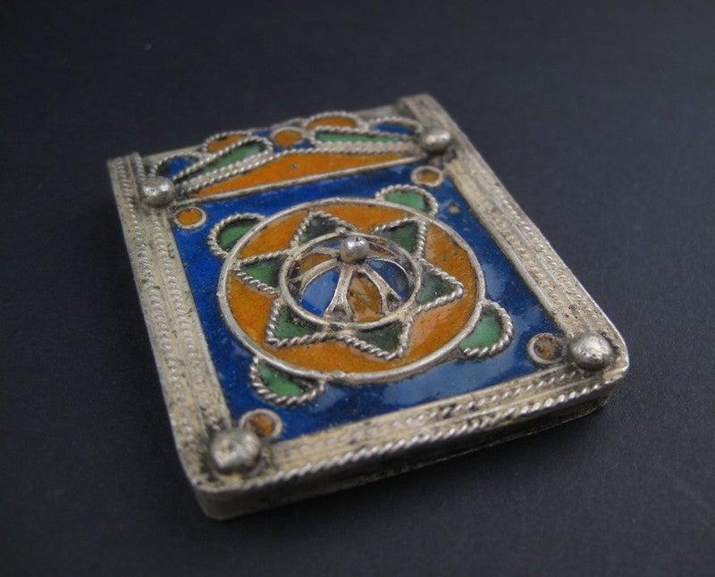 Unique pendant with Jewish Berber Star of David design. This enameled pendant is decorated with several colors. Jews are known to have lived in Morocco for nearly 2000 years and in historic terms were known for the talent at working metal and making jewelry. To this day, many artisanal metal designs are inspired by their ancient tradition.