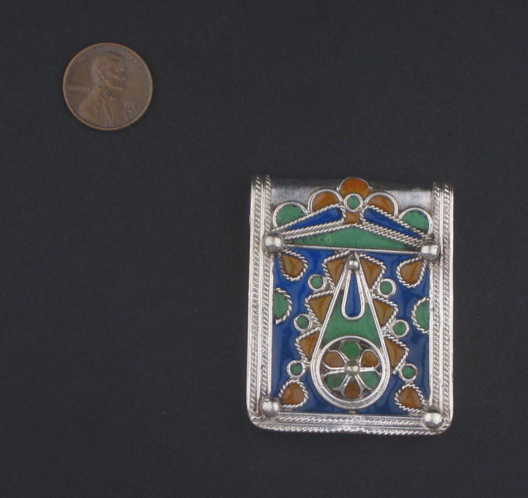 Unique pendant with unusual design. This enameled pendant is decorated with several colors and made using traditional techniques known to have been used by Jewish metal smiths. Jews are known to have lived in Morocco for nearly 2000 years and in historic terms were known for the talent at working metal and making jewelry. To this day, many artisanal metal designs are inspired by their ancient tradition.