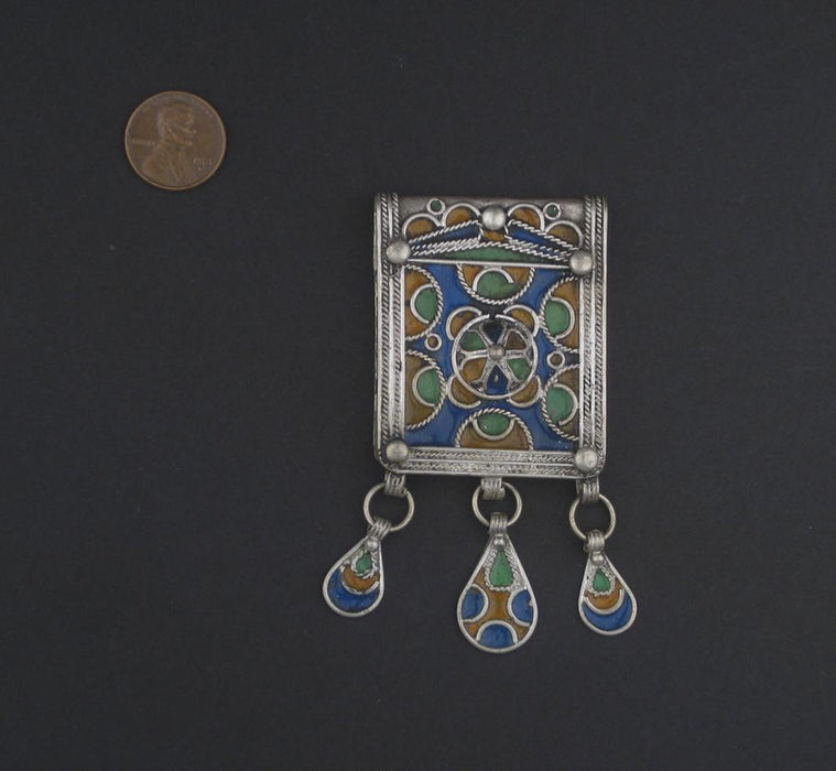 Unique pendant with unusual design. This enameled pendant is decorated with several colors and made using traditional techniques known to have been used by Jewish metal smiths. Jews are known to have lived in Morocco for nearly 2000 years and in historic terms were known for the talent at working metal and making jewelry. To this day, many artisanal metal designs are inspired by their ancient tradition. Design may vary slightly from pendant to pendant.