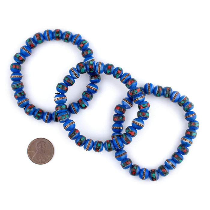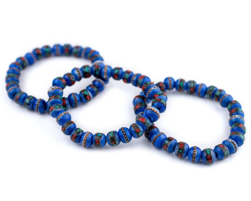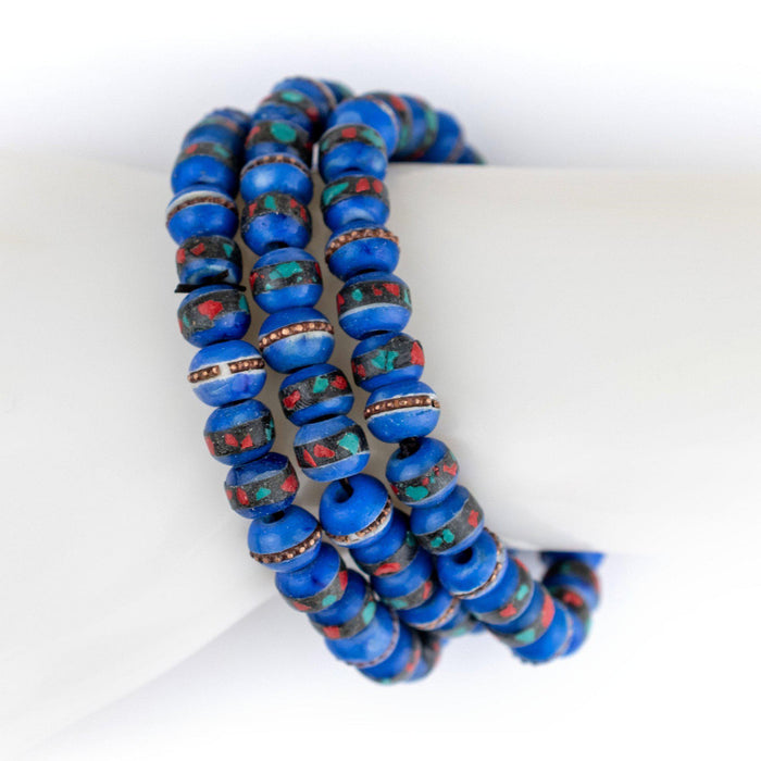 Malas are traditionally used in Buddhist culture as a part of the practice of meditation, however, today malas are enjoyed by people around the world looking to gain mental clarity and live in the present. Our collection of mala bracelets are handmade in Nepal using traditional inlaid beads. These beads are hand carved, inlaid with coral and turquoise style pieces, and strung 27 beads per 7.5 inch bracelet. Available in over 15 colors, choose your favorites to build your own unique stack! Beads may also be repurposed into your own unique jewelry designs. Multiple bracelets may be pictured, however each bracelet is sold individually.