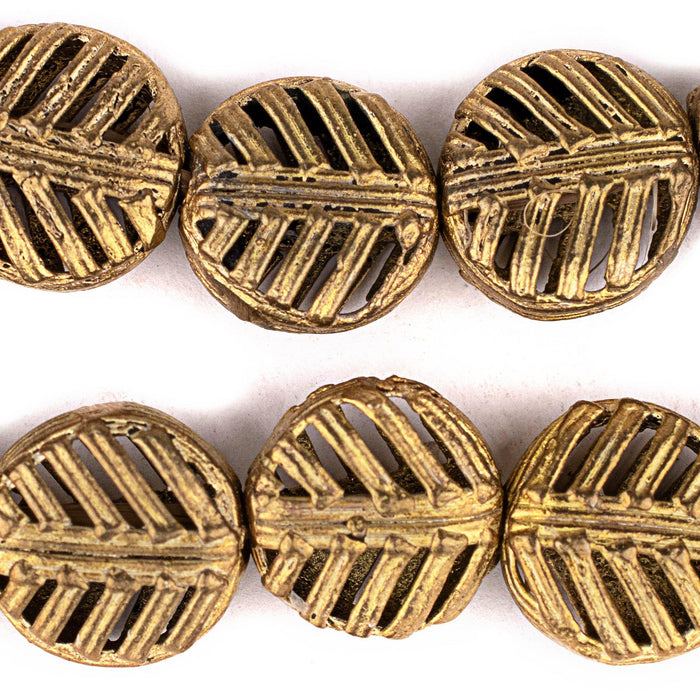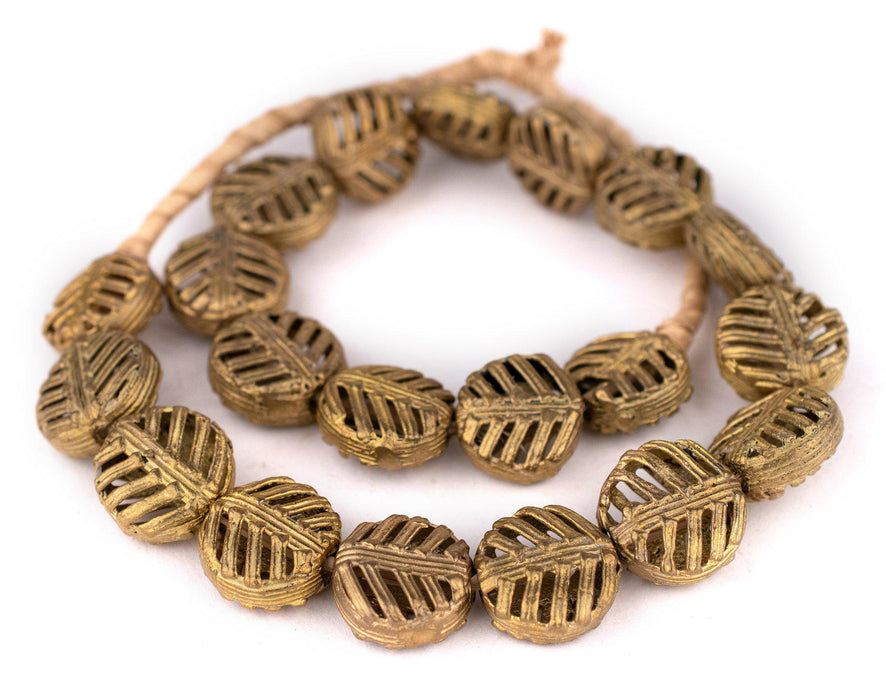 These brass beads have been fashioned by an artisan using the lost wax method. Is is a traditional bead making technique from West Africa. The unusual design of these beads is reminiscent of a plant leaf. Each bead measures approximately 21-23mm across with hole size of 3-4mm. These are hand made beads and it is not uncommon for a few on each strand to have imperfections.