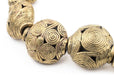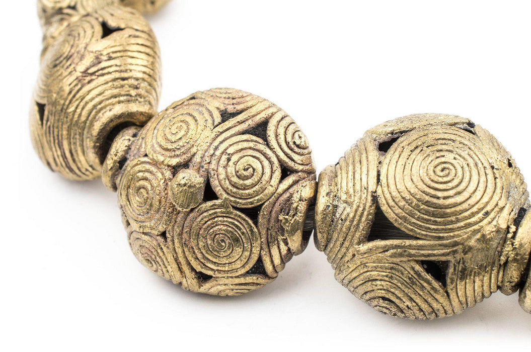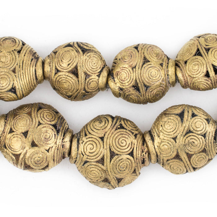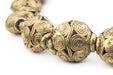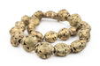 These authentic African brass beads were handcrafted in Cameroon in the workshop of a traditional metal smith. The intricate patterns that adorn each bead are characteristic of tribal motifs. Each long 32" strand of solid brass beads consists of approximately 20 individual beads measuring 29-41mm wide and 21mm across. The exceptional size of the beads makes them ideal for use as a centerpiece in a unique jewelry creation or just hang the strand on a wall to add some color and character to that special room. Each strand is unique and may vary slightly from photo. Limited supply.
