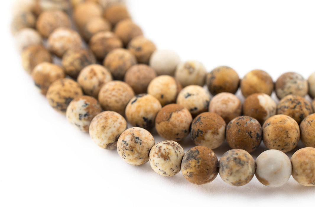 This beautiful strand of round picture jasper beads features a blend of brown and beige tones. Each bead measures approximately 4 x 4mm, with a hole size of 1mm. Strands measure approximately 15" in length. Multiple strands may be pictured. Each strand sold individually.