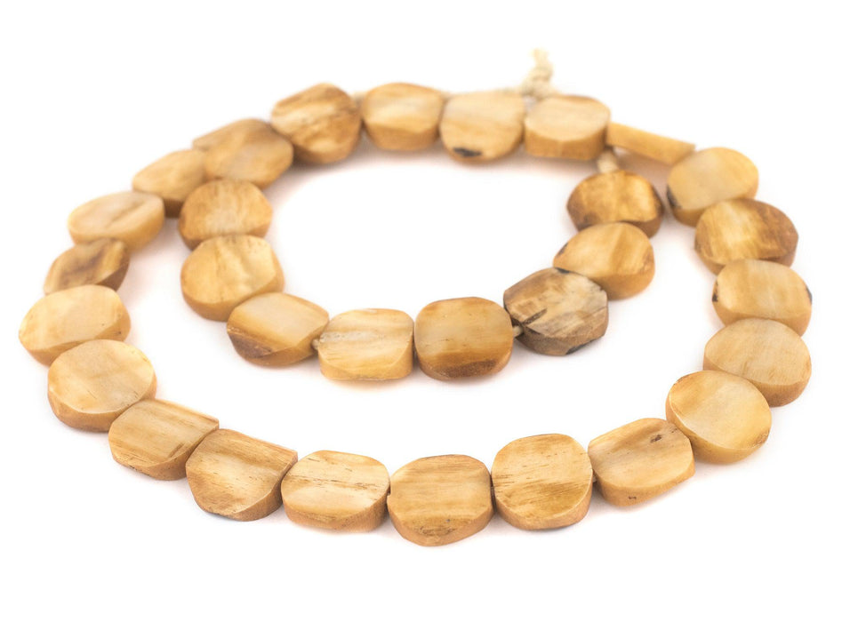 Admire this beautiful strand of bone beads from Kenya. East African bone beads are handcrafted by artisans using recycled cow bone. Each bead is individually carved and polished, and is truly one of a kind. These beads measure approximately 20 x 6mm, with a hole size of 2mm. Strands measure approximately 28", and have approximately 30 beads each. These are a great find for any beader looking to do something truly unique with their work!