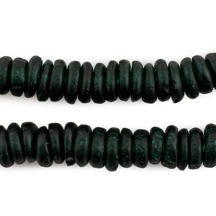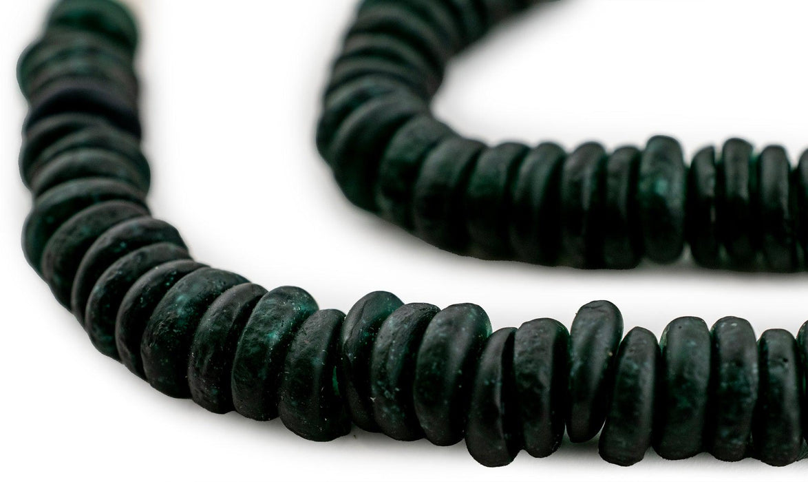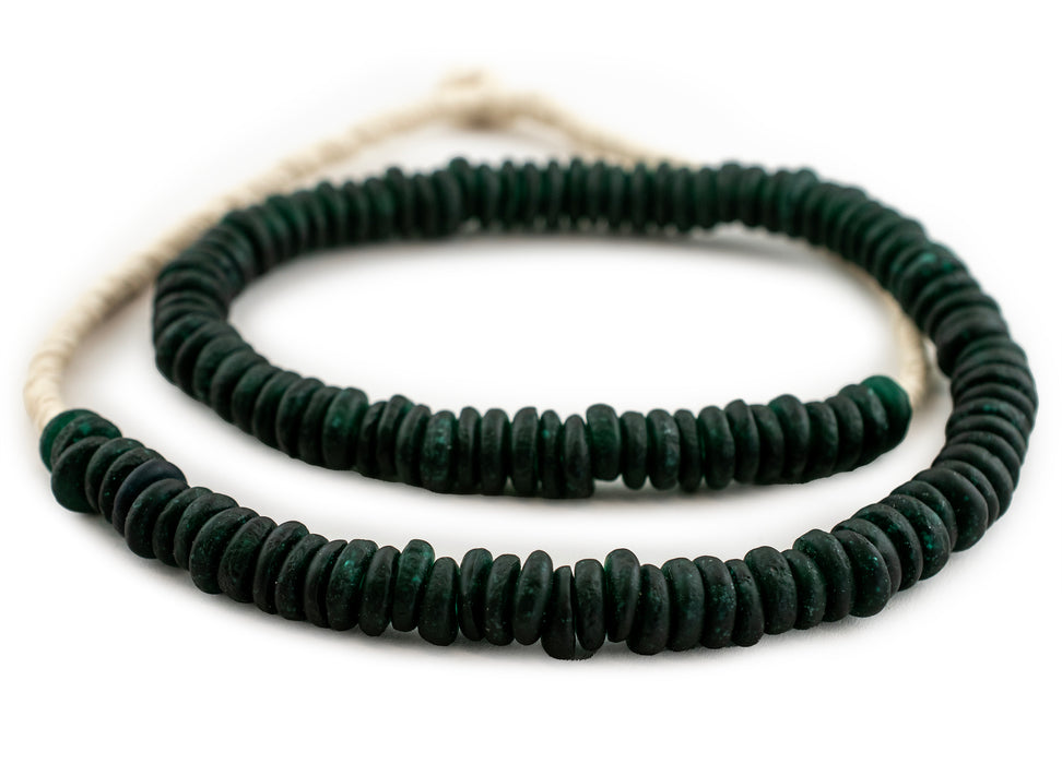 These beautiful Emerald Recycled Glass Beads will help add a regal touch to your upcoming design projects. Handcrafted by artisans in Ghana these beads are made by using crushed recycled glass. The crushed glass is placed in molds and heated in a firewood oven, resulting in these beautiful beads. Each bead measures about 3 x 11mm with a hole size of approximately 2mm. You will receive a full strand measuring roughly 26". Grab a strand for your design kit today.