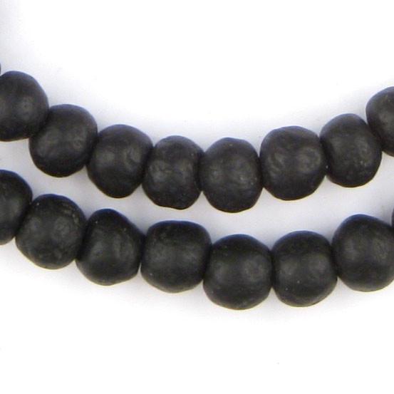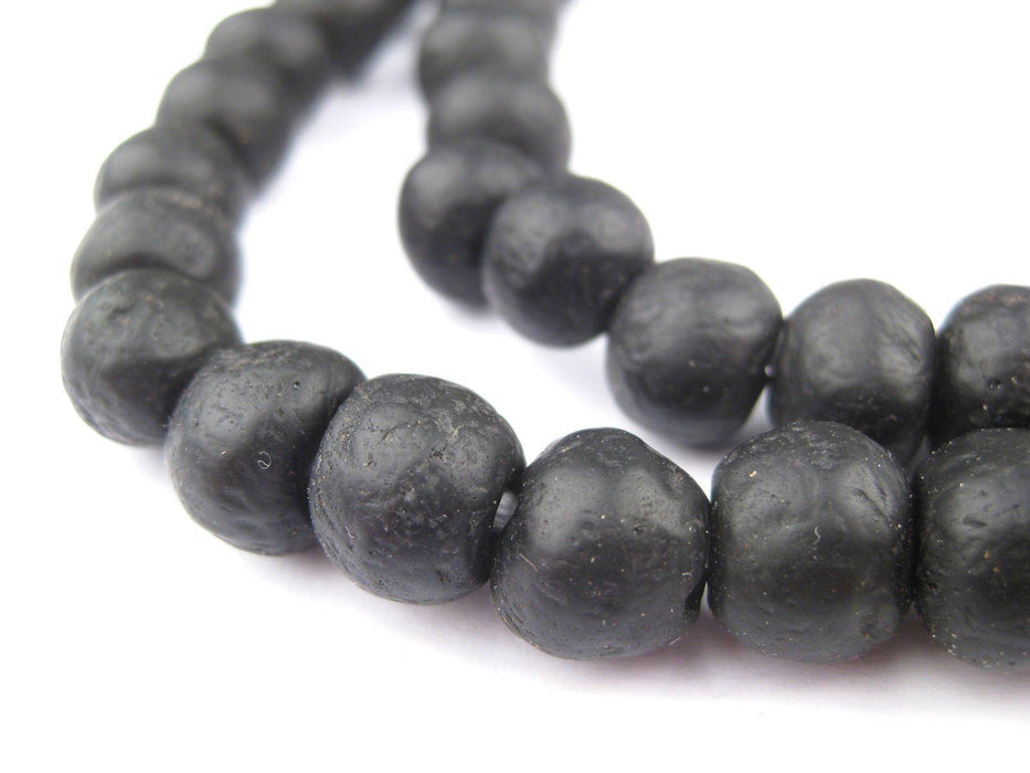 Recycled glass beads are a type of indigenously produced African bead from Ghana West Africa. These beautiful black color recycled beads are made using an old method that has been used for centuries. The glass itself is derived from a variety of recycled sources including old beverage and medicine bottles. The procedure for making the beads consists of a number of steps whereby powdered glass is poured into molds of clay and baked in a specialized oven. These beads are produced in large part by the Krobo tribe and through recycling glass are environmentally friendly.
