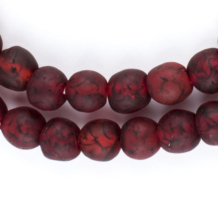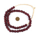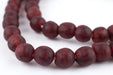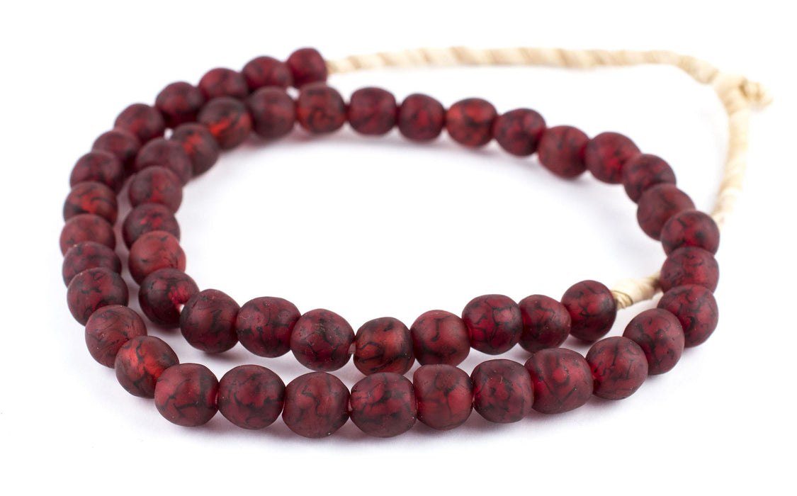 Recycled glass beads are a type of indigenously produced African bead from Ghana West Africa. These beautiful red color recycled beads are made using an old method that has been used for centuries. The glass itself is derived from a variety of recycled sources including old beverage and medicine bottles. The procedure for making the beads consists of a number of steps whereby powdered glass is poured into molds of clay and baked in a specialized oven. These beads are produced in large part by the Krobo tribe and through recycling glass are environmentally friendly.