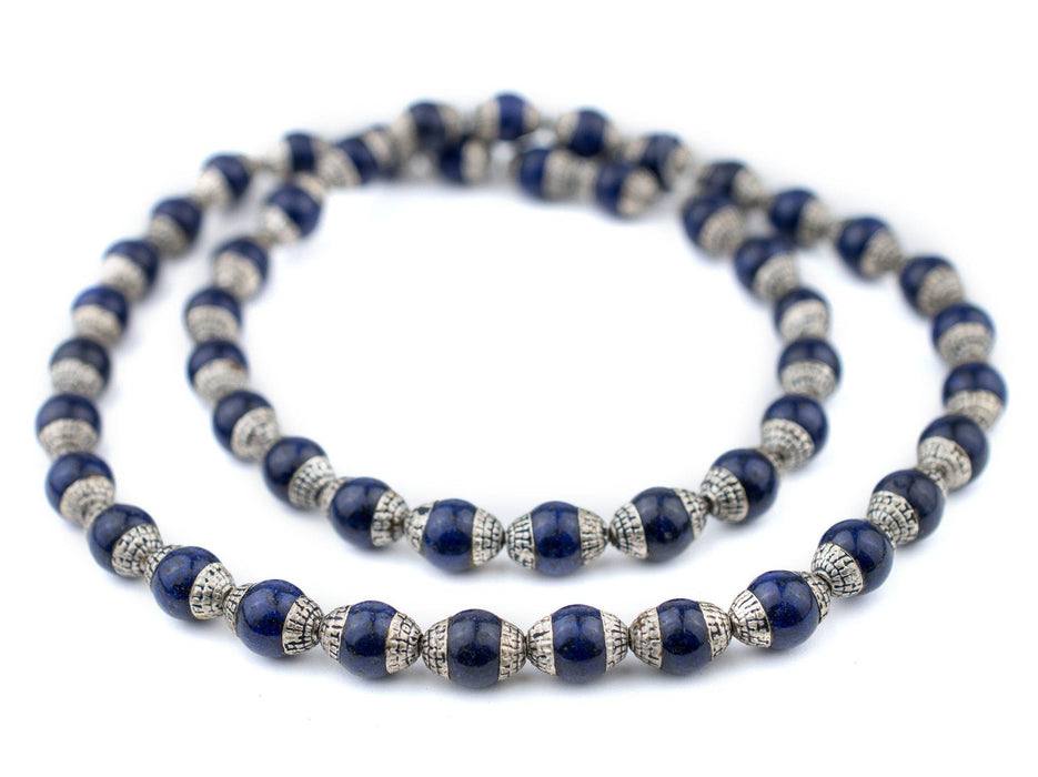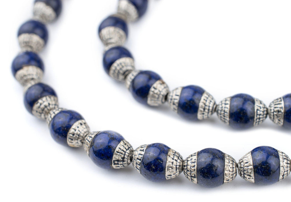Admire this great strand of Lapis Lazuli stone beads. Each bead is made by setting a round stone between two engraved silver caps. Lapis is a natural stone that has been prized since antiquity for it's deep blue color. Lapis stone from the mines of central Afghanistan has been used throughout history both in jewelry as well as to make distinctive blue dyes. The striking detail of these beads is apparent in the careful workmanship. Each bead measures approximately 10-12mm in length by 8-10mm in diameter. Highly versatile for your creative jewelry projects. Use them in bracelets, earrings, necklaces, and more!