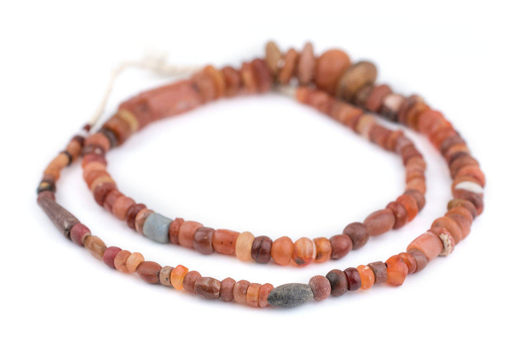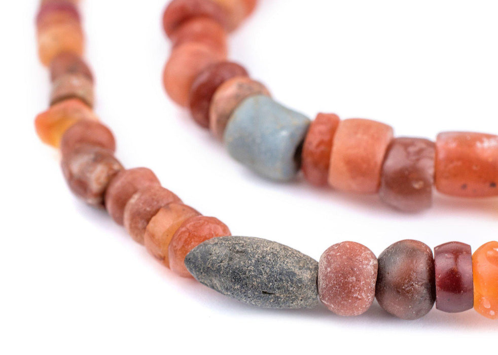These old stone beads are both colorful and unusual. Natural stone was among the earliest materials used by ancient cultures to make beads for personal adornment. Beads such as these are discovered in the ground where they have sometimes laid undisturbed for hundreds if not thousands of years. These specific beads were found in Mali West Africa. Each graduated strand will consist of a unique assortment of sizes and shapes and may include stones such as Carnelian, Jasper, Rock Crystal, Quartz, or other minerals as well as an occasional glass bead. These beads are truly one of a kind! You will receive the exact strand pictured.