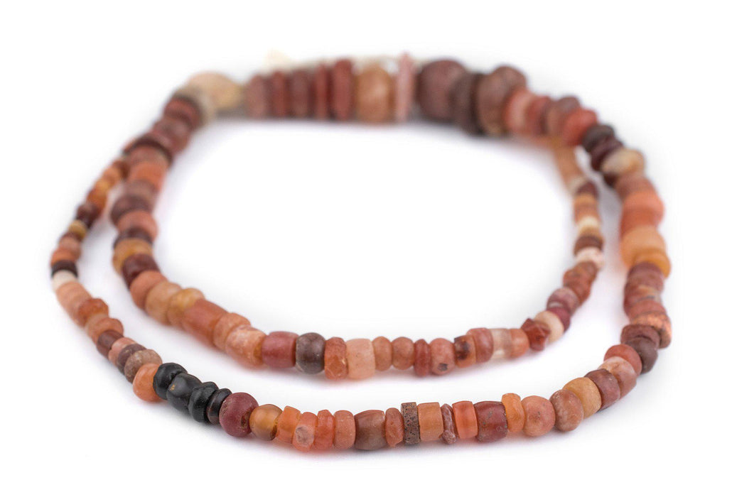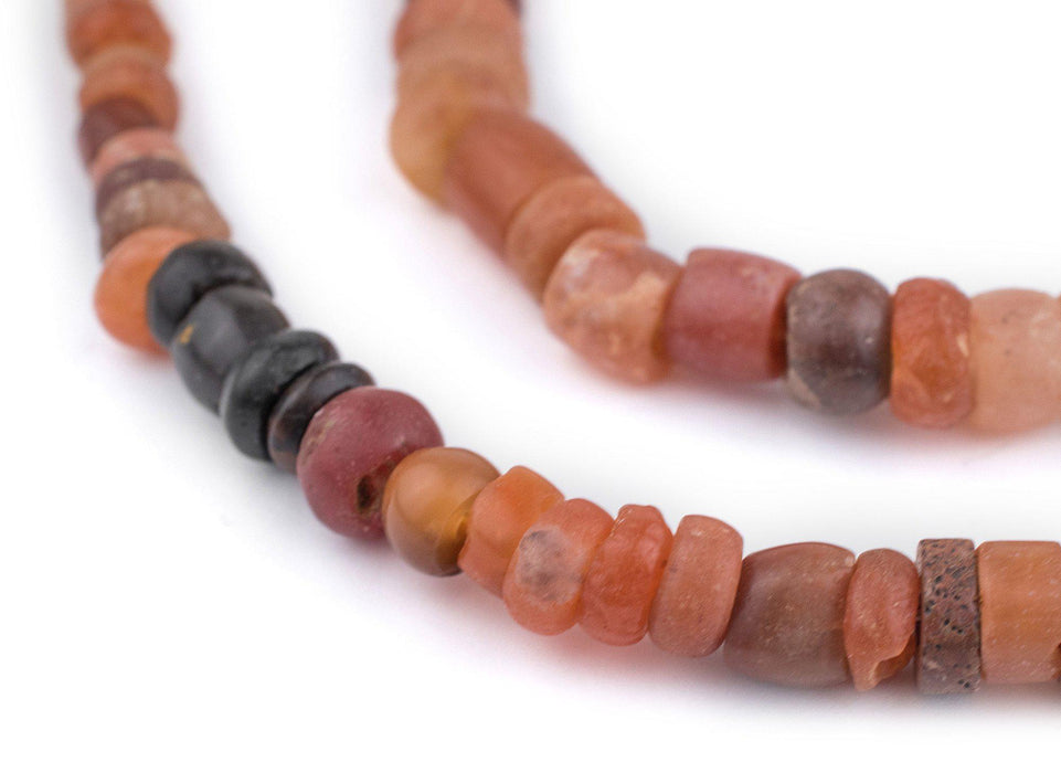 These old stone beads are both colorful and unusual. Natural stone was among the earliest materials used by ancient cultures to make beads for personal adornment. Beads such as these are discovered in the ground where they have sometimes laid undisturbed for hundreds if not thousands of years. These specific beads were found in Mali West Africa. Each graduated strand will consist of a unique assortment of sizes and shapes and may include stones such as Carnelian, Jasper, Rock Crystal, Quartz, or other minerals as well as an occasional glass bead. These beads are truly one of a kind! You will receive the exact strand pictured.