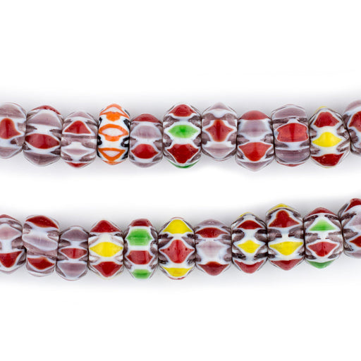 Chevron beads are a variety of glass beads that were first created by Venetian and local Murano artisans in Northern Italy following the Middle Ages in the late 1400s. Other names for these beads are Rosetta and Star beads. Chevron beads were traded across the world especially in West Africa where they were introduced by visiting Dutch merchants. Due to their maritime strength and prowess, Dutch traders traveled widely and spread many types of glass beads throughout the world including Chevron beads. The glass industry was a big business and led to many unique beads that have been passed through the ages. In some sense the Chevron trade bead is considered the aristocrat of the bead industry because of it difficult to make and highly coveted as a trading item. In one of the earliest iterations, the Chevron consisted of seven different layers. This is generally believed to be the one hundred year period starting around 1480. In West Africa, European traders exchanged them as a form of currency for a variety of goods and services such as palm oil, ivory, possibly slaves, and luxury items that were in demand in mainland Europe.