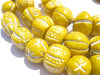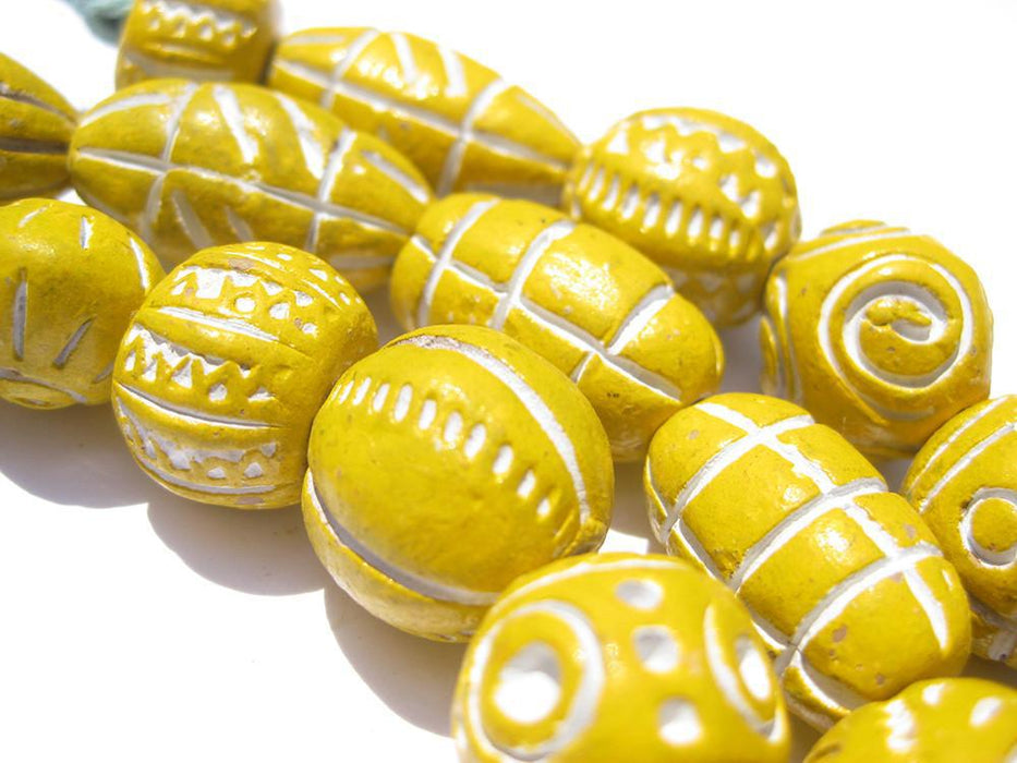 Amazing strand of authentic Yellow Terracotta Clay Beads from Ghana. These great strands include a medley of shapes including round, bicone, cylinder, and other interesting shapes. Each long strand combines a unique combination of beads each individually patterned with traditional tribal designs. These beads have been strung on a durable cord and finished with a nice multicolor weave. Beads are relatively lightweight. Your strand may vary slightly in combination of beads but will be very similar. Wear these beads 'as is' with your favorite outfit or use them in your unique jewelry. So many possibilities!