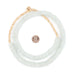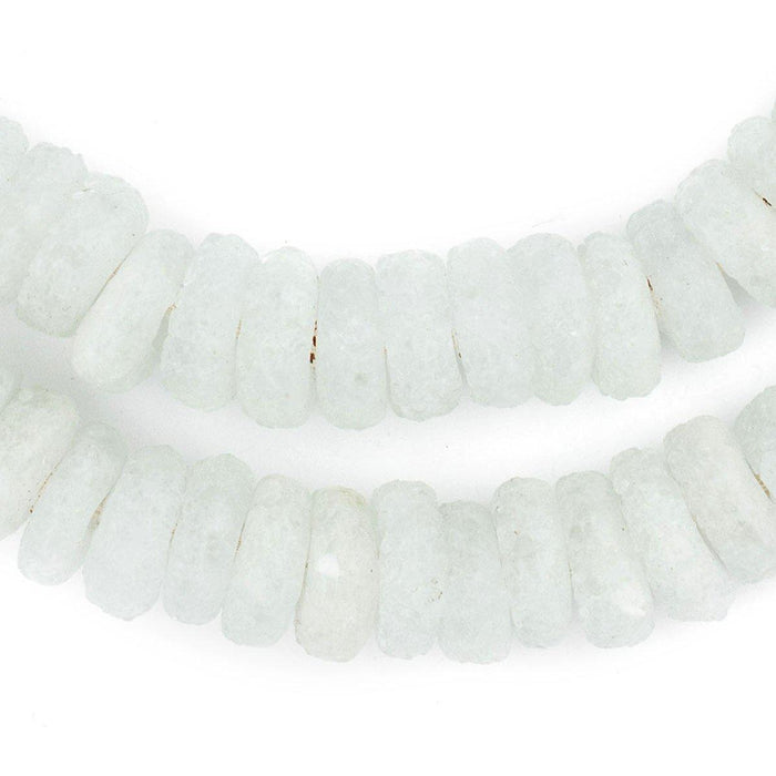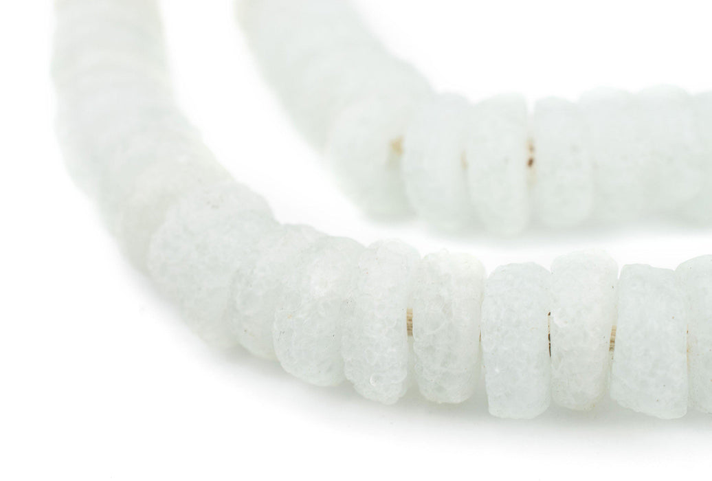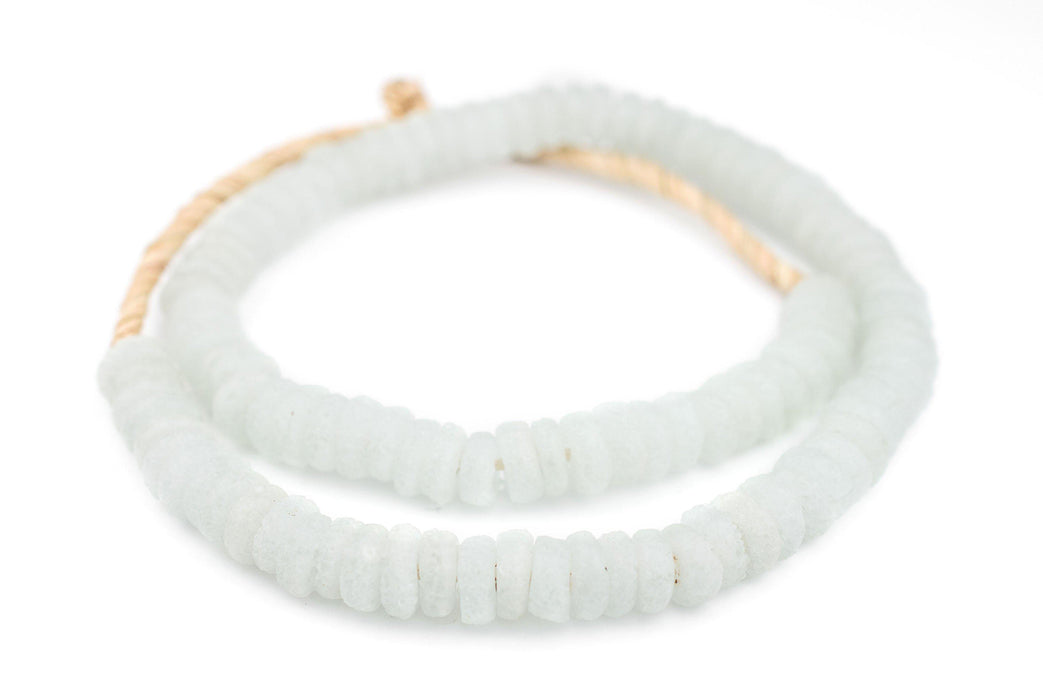 Take a look at these beautiful rondelle shaped recycled glass beads. Powder glass beads are made by crushing glass to a fine powder and heating it so that the particles fuse together. The glass is then poured into clay molds, with a cassava leaf stem used to make the hole. They are baked in an oven and the glass fuses and the cassava stem burns up. This technique has been used in Africa for centuries.