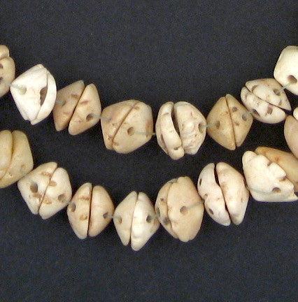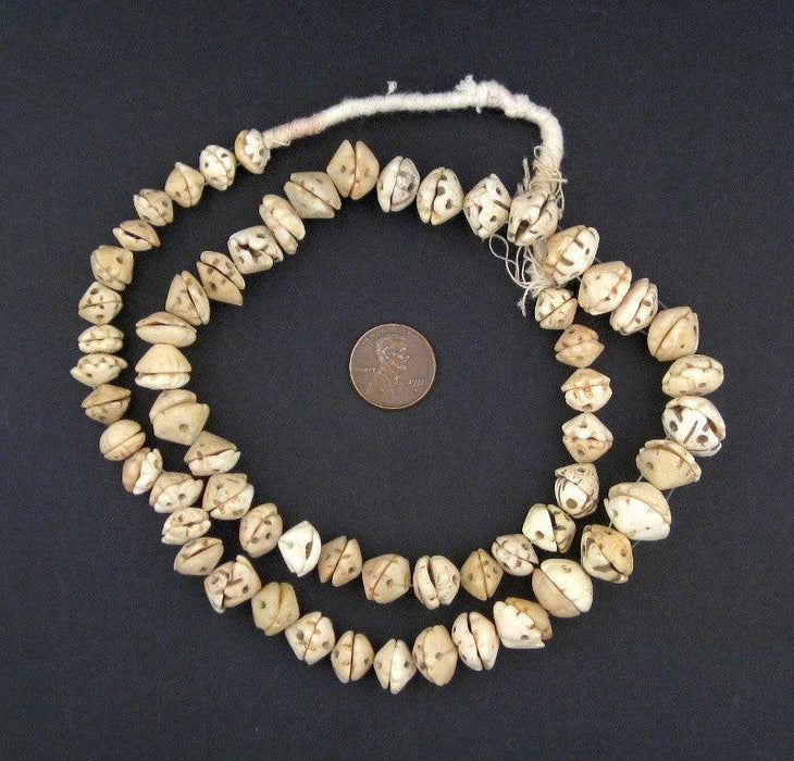 Checkout these beautiful antique beads made from old conus shell. These rare beads will add a rich character to your beaded jewelry. The strand is approximately 24-26" long, and each bead measures 10-12mm diameter. Please note that these beads are old and some strands may have fraying string at the top. Each strand is unique and may vary slightly from photo. Please inquire in advance if you have any specific requests or concerns.
