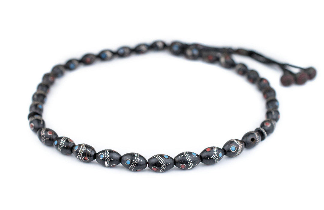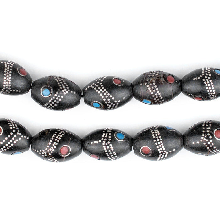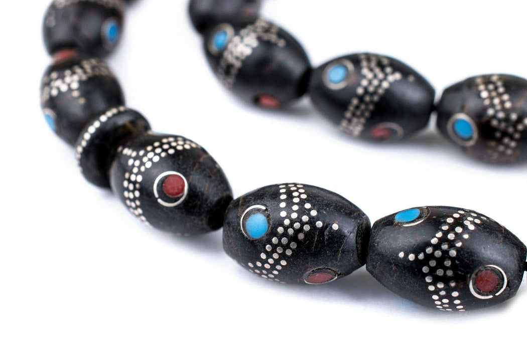 Oval Antique Silver Inlaid Black Coral Beads from Yemen (14x9mm)